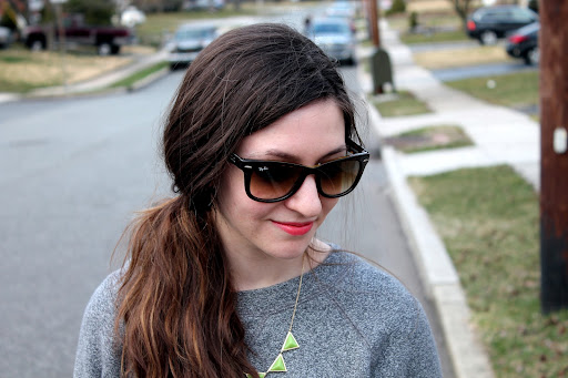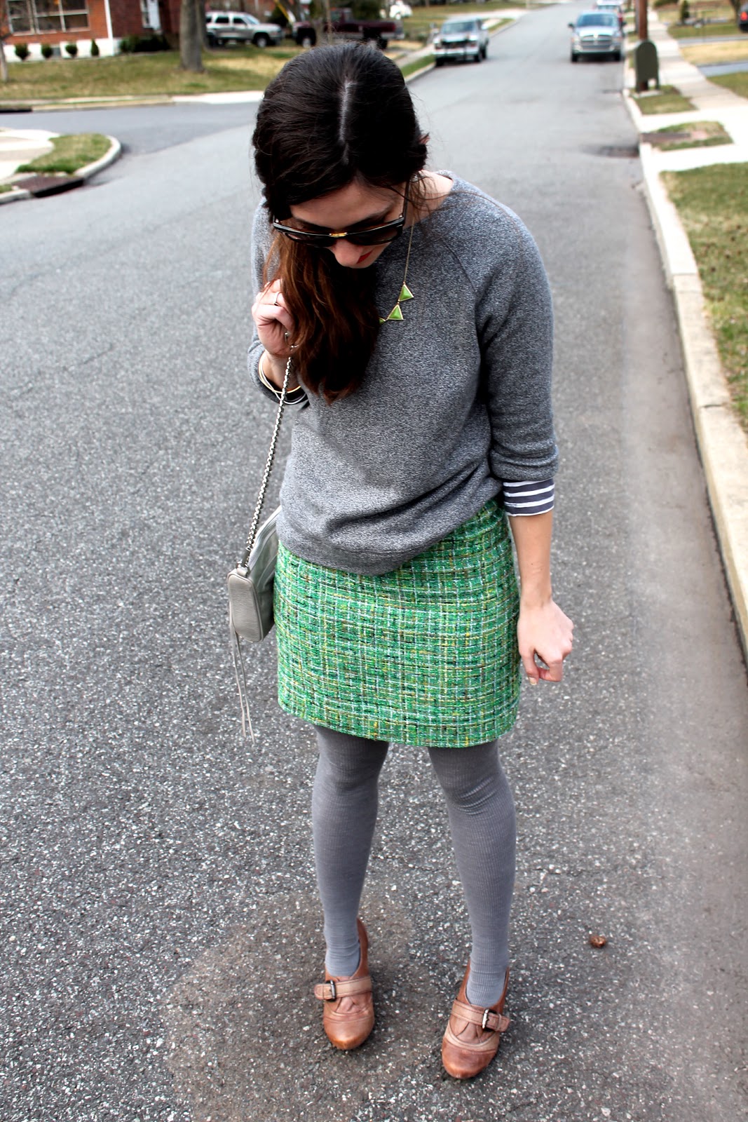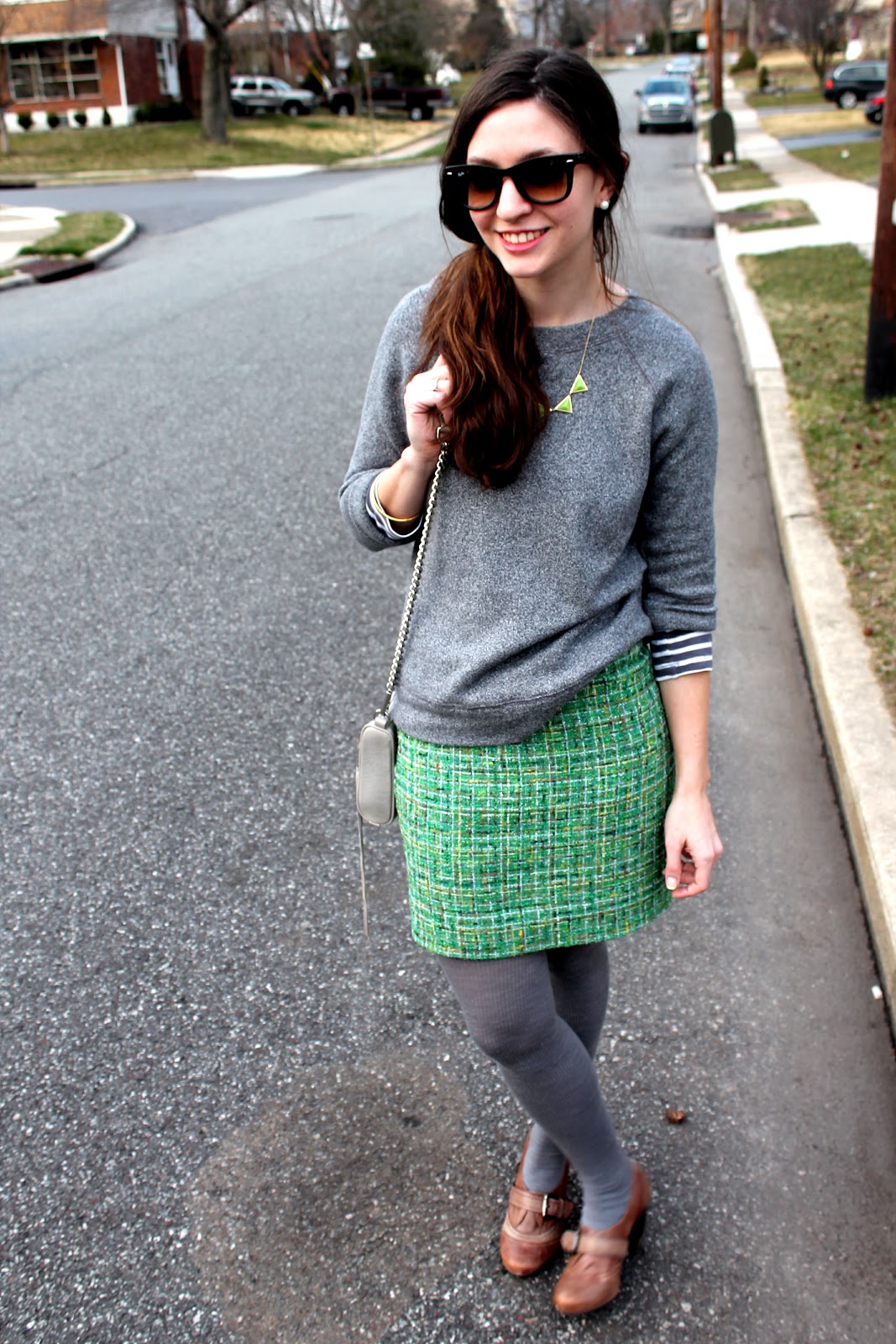 I wore this over the weekend to a casual brunch and day of shopping with my sister-in-law 🙂 We had a really good time…sometimes you just need some girl time! I dressed down my green tweed (don’t you just love the color variations in this skirt? J.Crew has some really gorgeous tweeds!) skirt with this gray sweatshirt and (unfortunately) ribbed tights… it’s still a little too chilly to go without tights yet. I liked the gray on gray look with the pop of color (and I added a lime-colored necklace for an extra burst of color)… I think it kept the look a little more casual.