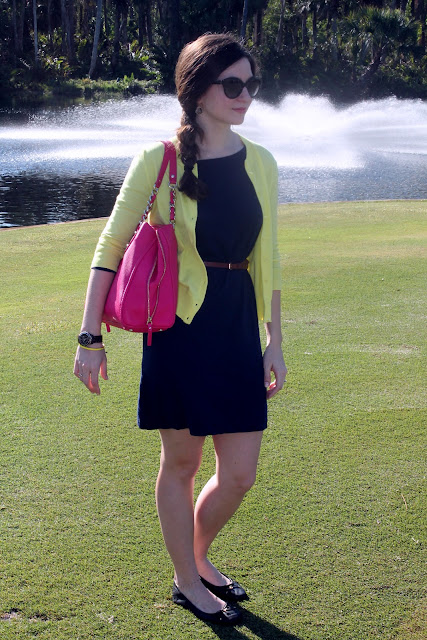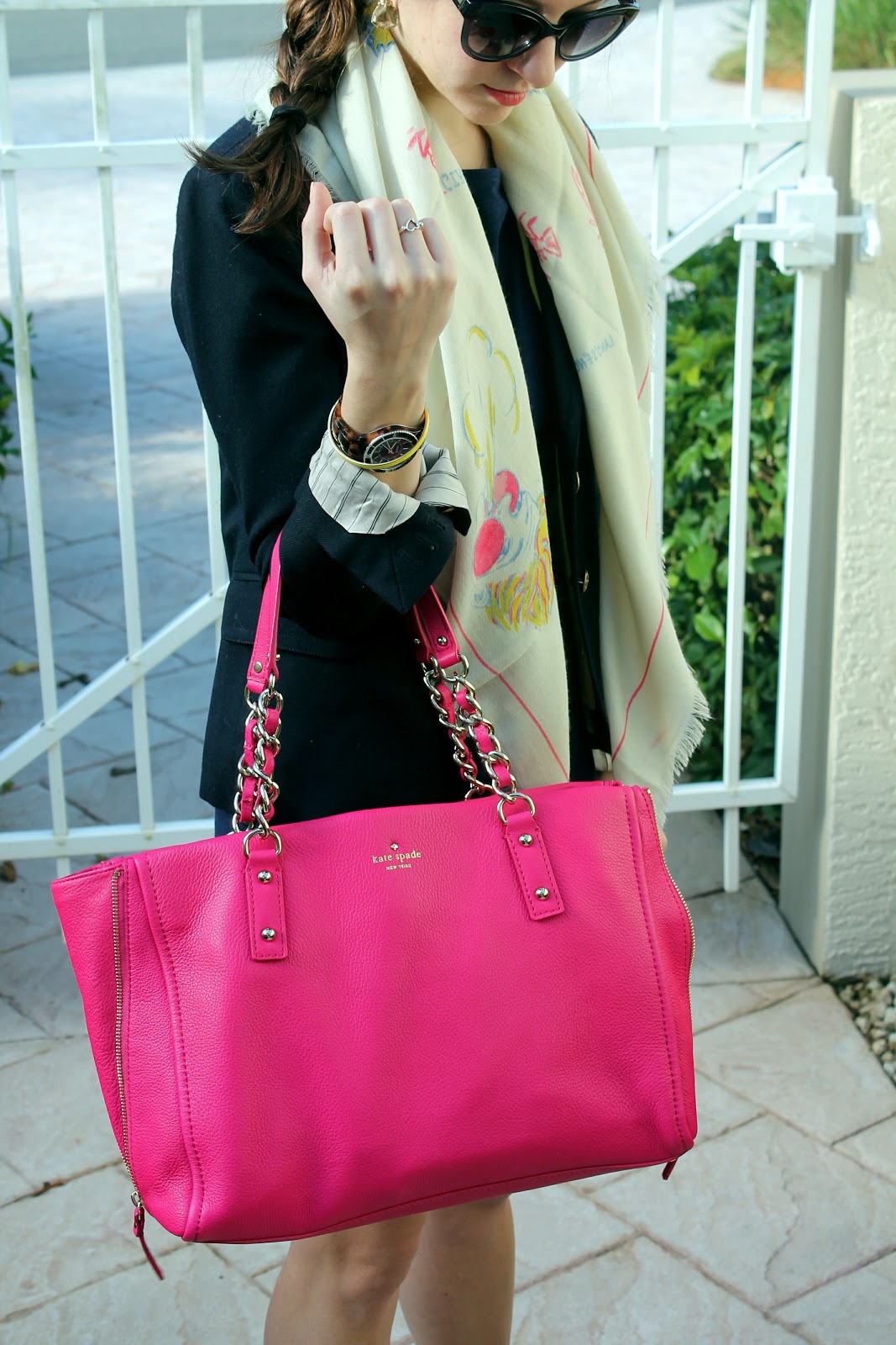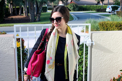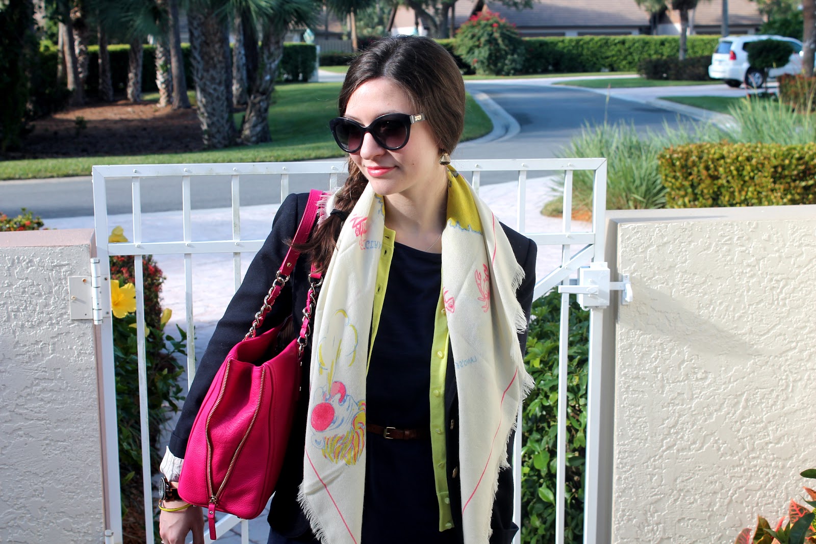 blazer- J. Crew, dress- Lilly Pulitzer, cardigan- J. Crew, belt- J. Crew, flats- Sam Edelman, scarf- Madewell, bag- Kate Spade, watch- Fossil, bracelet- J. Crew, earrings- Anthropologie, sunglasses- Kate Spade