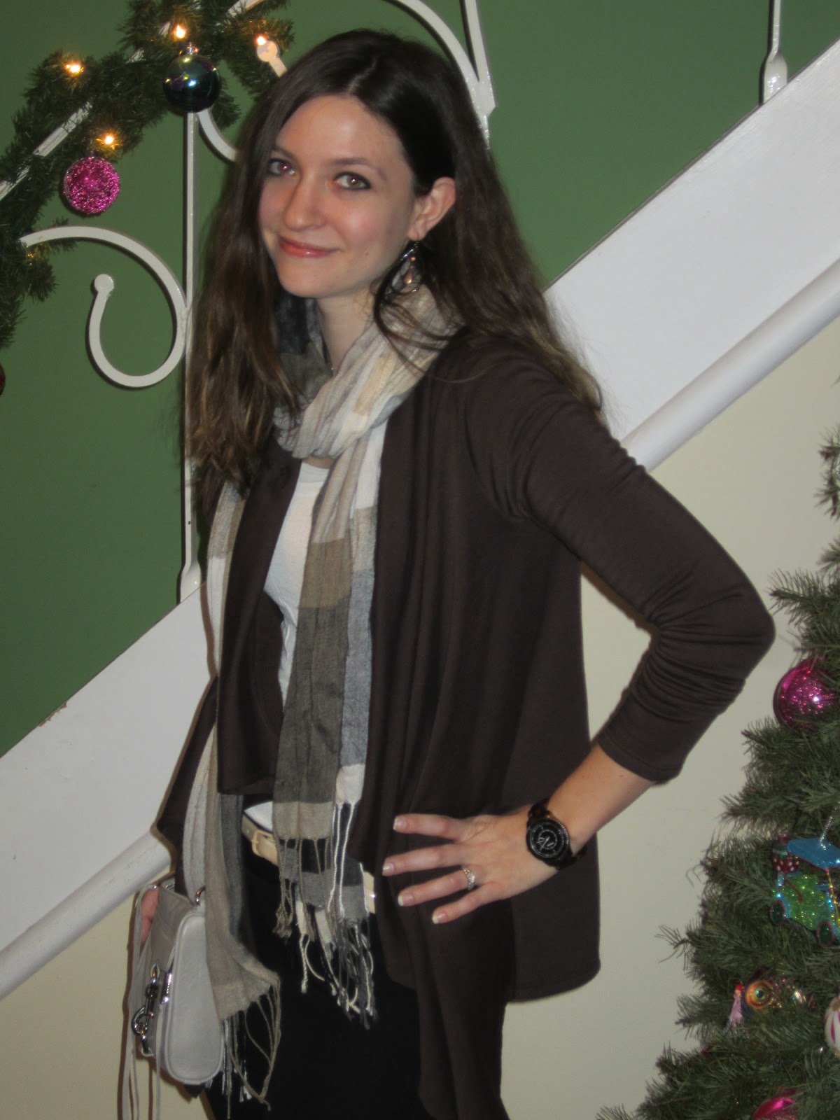 pants- J. Crew, tee- Heritage, cardigan- Nordstrom, belt- J. Crew, shoes- Steve Madden (old), scarf- H&M (old), watch- Fossil, bag- Rebecca Minkoff