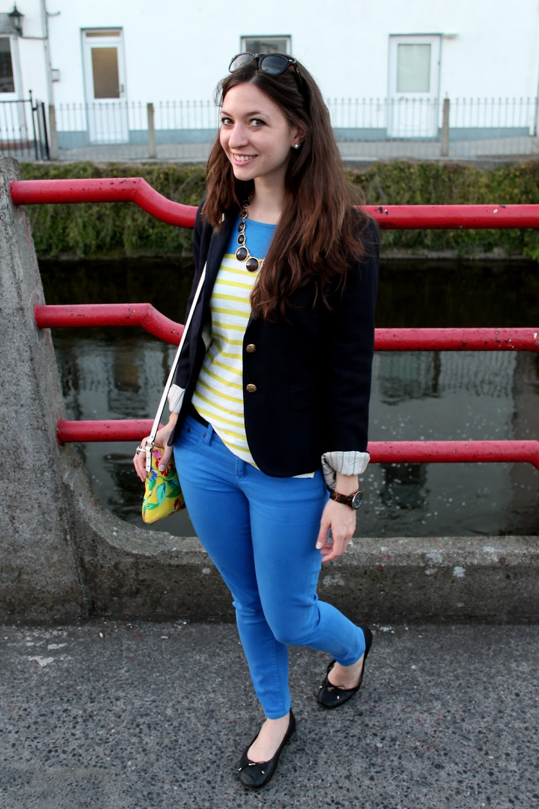 These pictures are from our first night in Galway. It was a really nice day, but even so I still needed longer sleeves and my navy blazer (which, by the way, is the perfect travel companion). I love the combination of yellow and blue so this outfit felt very natural for me, though it was noticeably brighter than what everyone else was wearing walking around town… as usual 🙂 Again, I added some Sam Edelman flats for comfort and a statement necklace and my yellow Kate Spade bag to liven up the look.