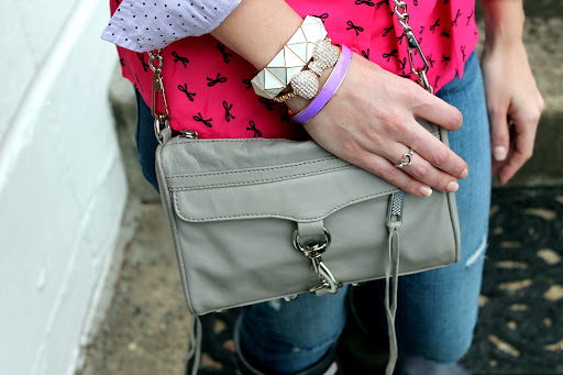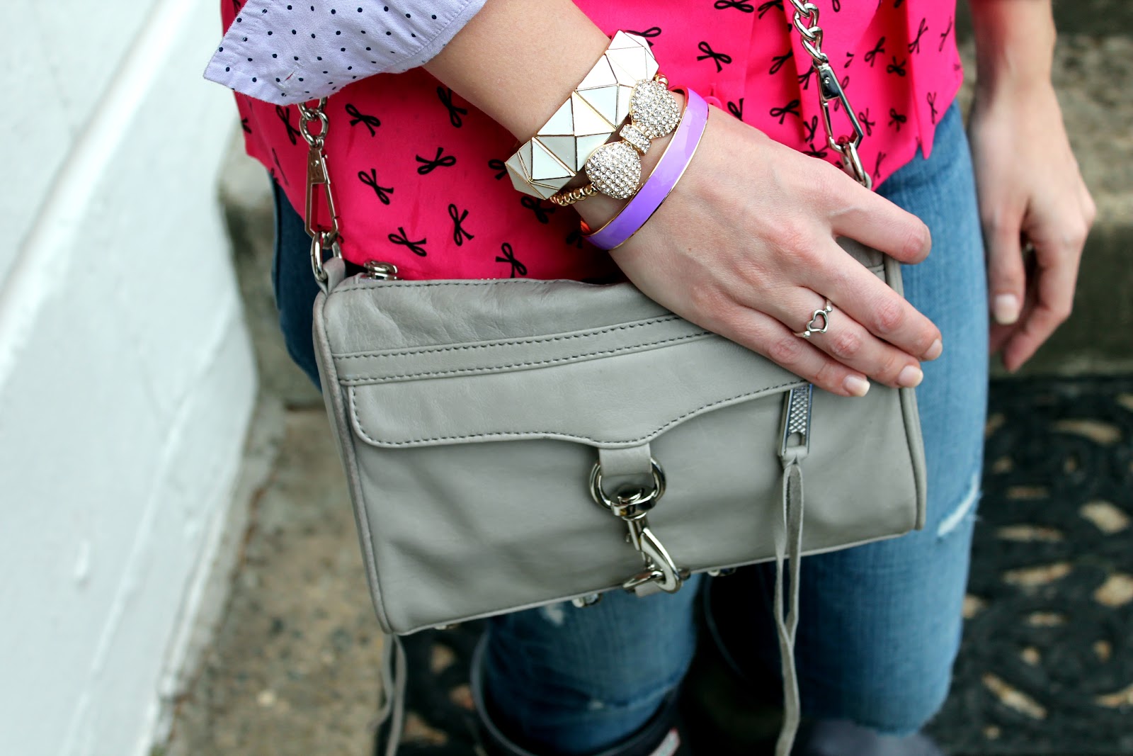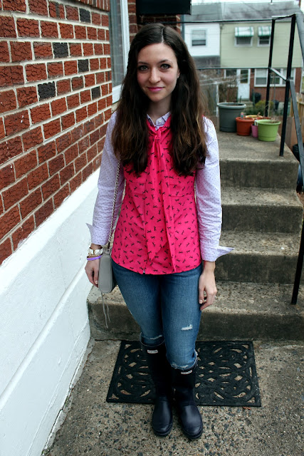 blouse- Ann Taylor Loft, shirt- J. Crew, jeans- J. Crew, bag- Rebecca Minkoff, boots- Hunter, bracelets- Bedazzled Boutique, Forever 21, J. Crew