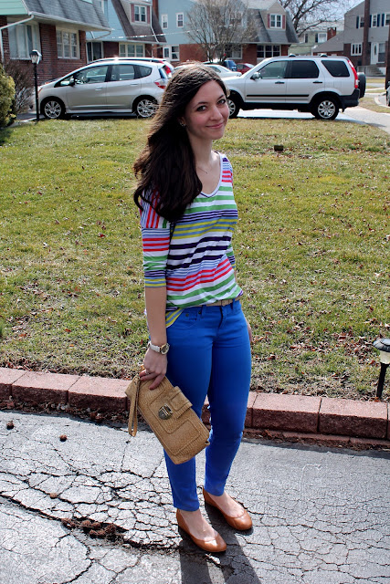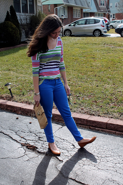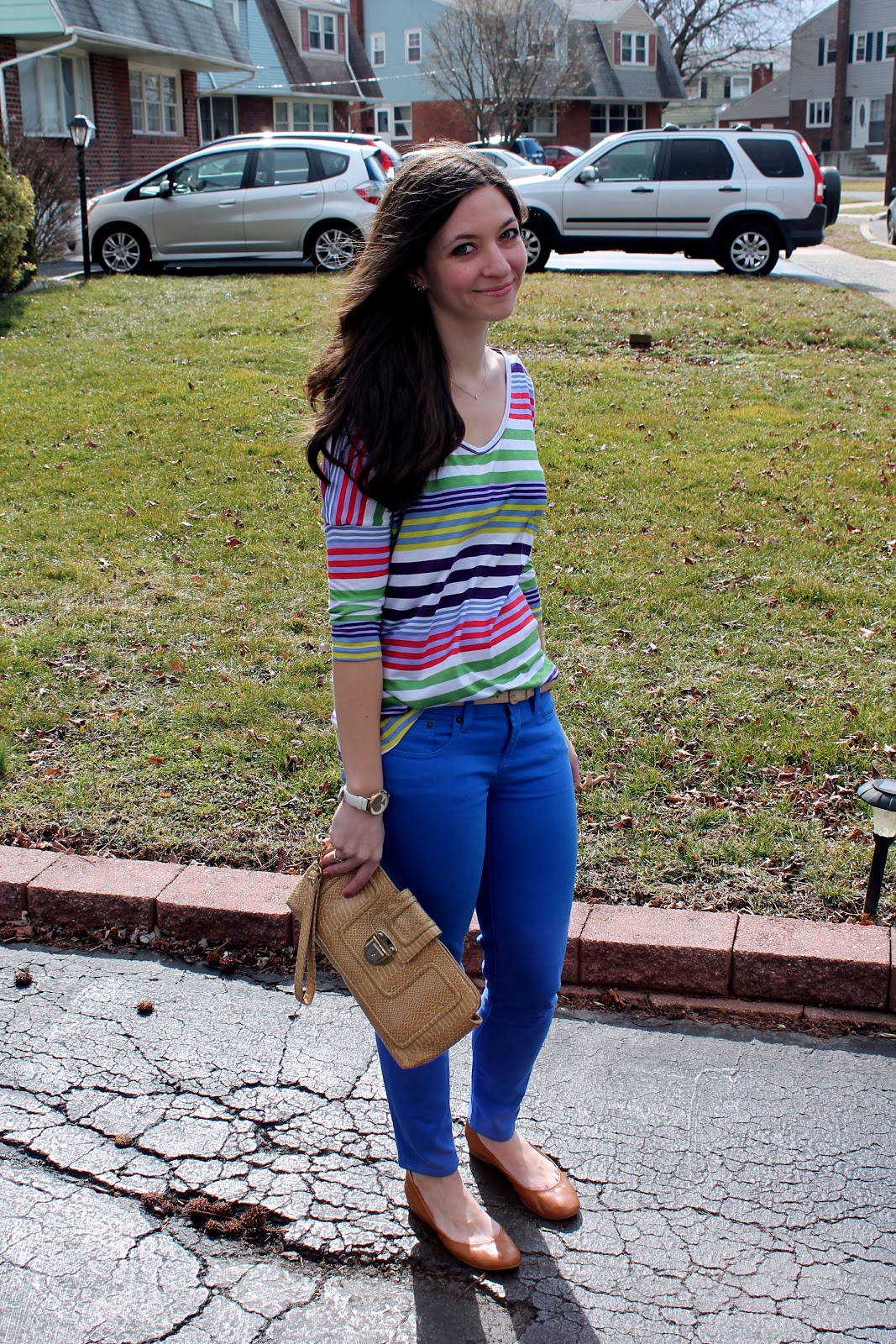 I really do love these cobalt toothpick jeans from J. Crew… the pop of blue is bright enough to make them on trend but neutral enough to go with almost everything in my closet. I like pairing color on color and even though there is no cobalt in this striped top, it works because of the similar shades of purple and blue in the stripes. I paired this outfit with a nude belt, tan flats, and a sand colored clutch (with a fun snakeskin pattern) to anchor the bright hues. What do you think about color on color? If this is too much for you, color blocking is another fun way to play with brights… it is also much easier to tailor to your own style (you can tone down the colors, add more neutrals, use just one pop of color, etc).