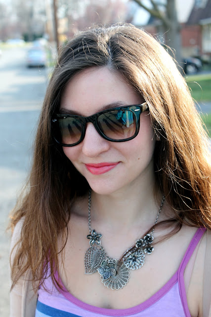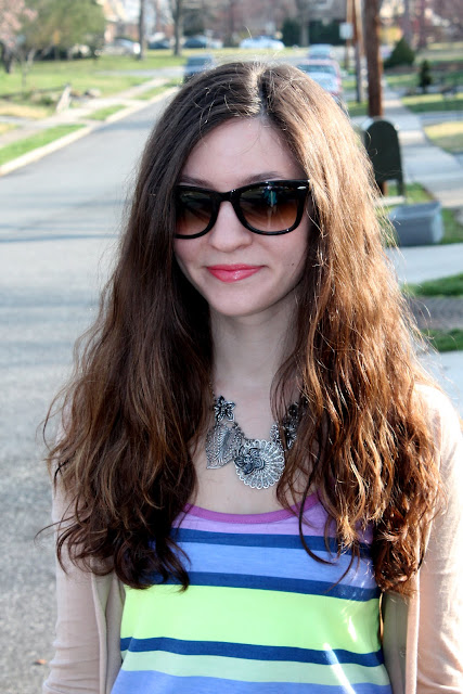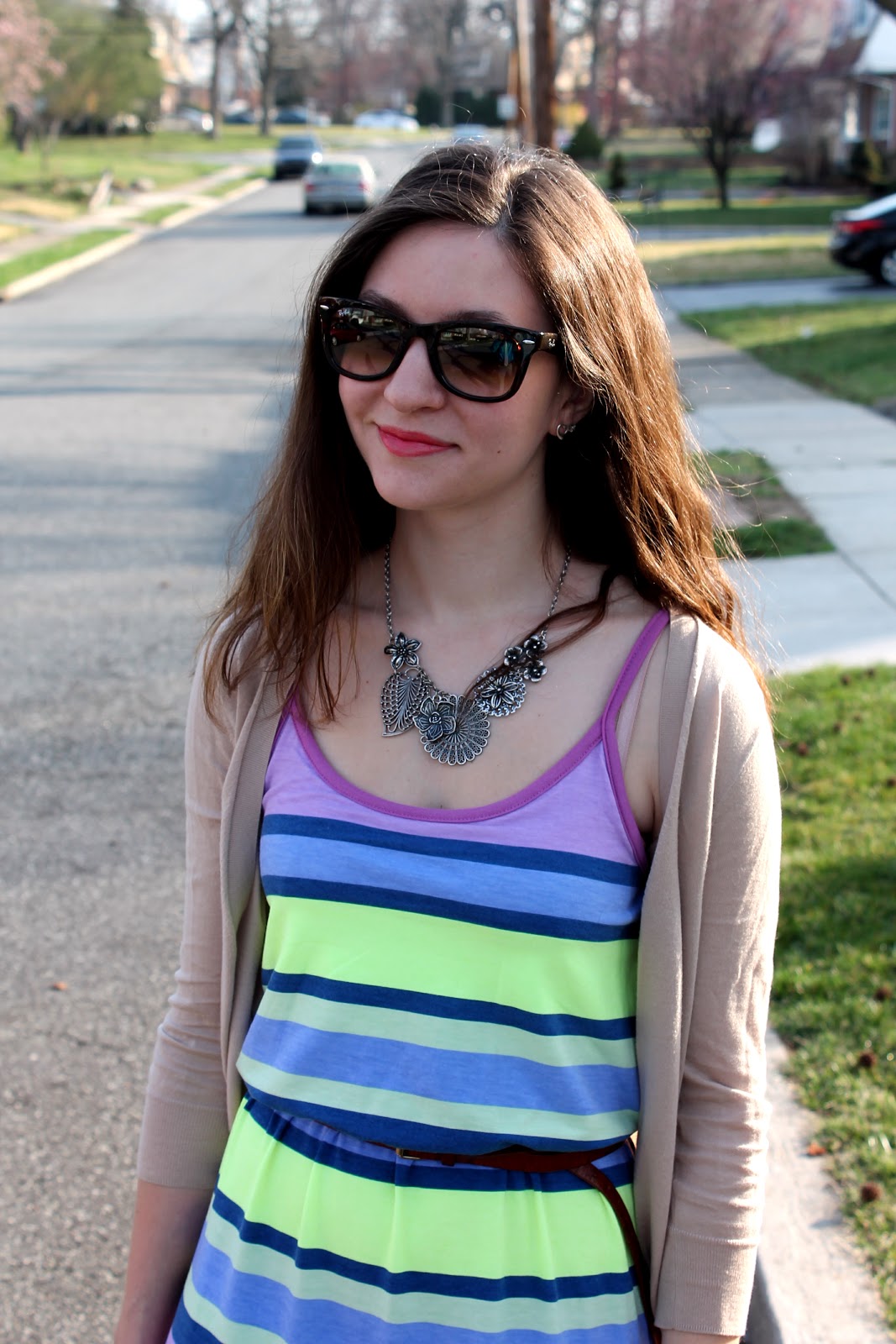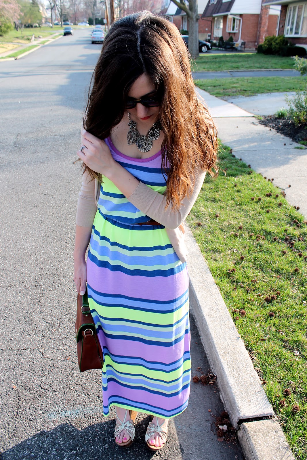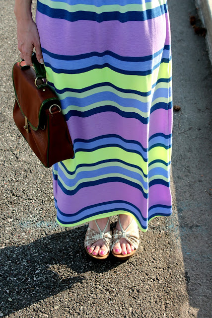 We had a bout of summer weather here… brief but beggars can’t be choosers :)… and I was really excited when I realized it was going to be warm enough to wear this dress (I thought I wasn’t going to have a chance for at least another few weeks)! The bright colors are so on trend for spring with the violet, lemon, and dusky blue and the fact that those colors are combined in a stripe pattern on a maxi… it doesn’t get much better than that! I added neutral floral print wedges and a silver floral necklace to add some interest to the look and to incorporate one more spring trend, mixing prints (I’ve tried mixing prints before and I love it!)! The neutral bag and cardigan both ground the look and help to pull it all together (especially with the similar hues of the cardigan and print on the wedges). What warm-weather item are you excited to wear?