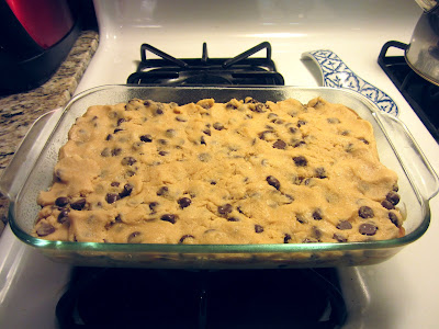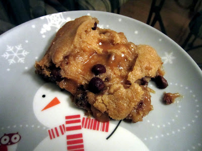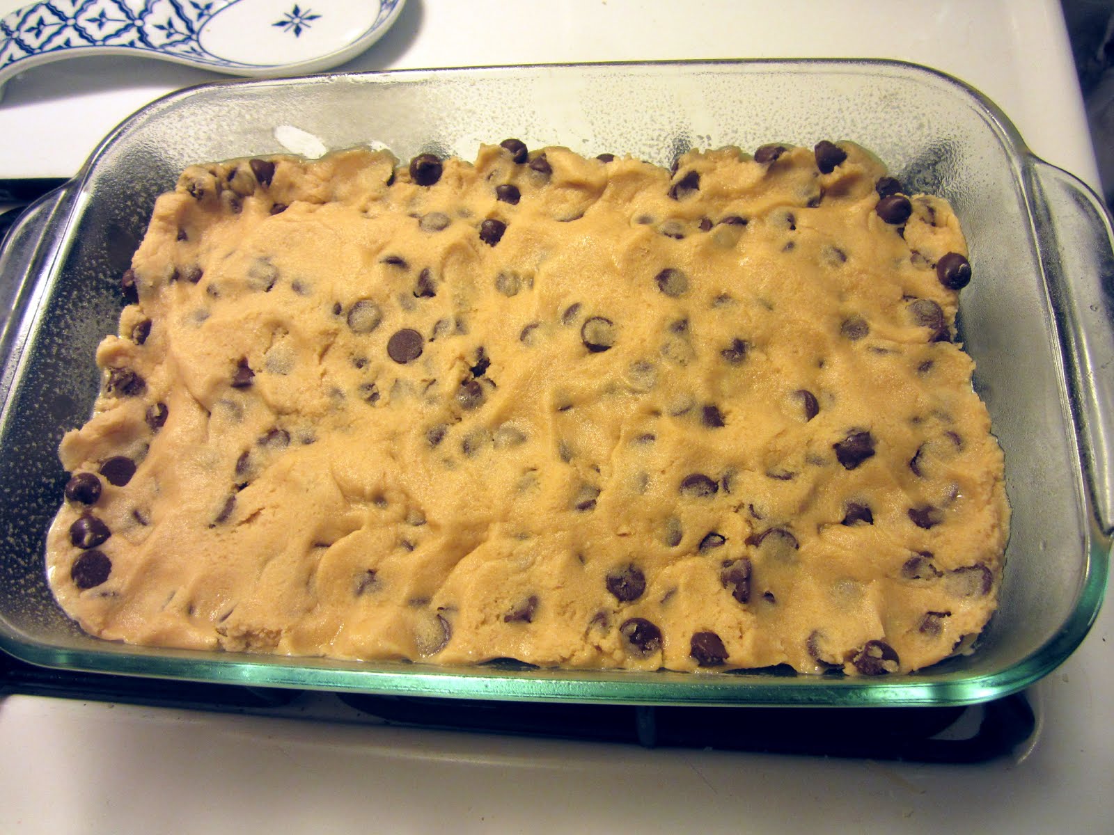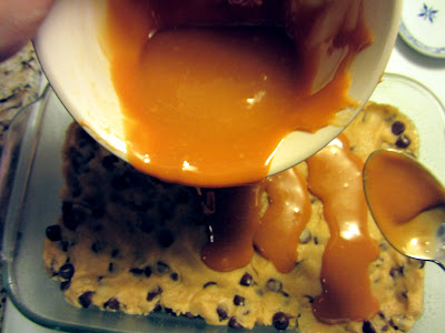 This is a relatively simple recipe. You can really substitue any cookie batter you want… I used my own variation of Toll House’s chocolate chip cookie recipe and then just made the caramel according to the directions on two peas and their pod. I also used their baking instructions.