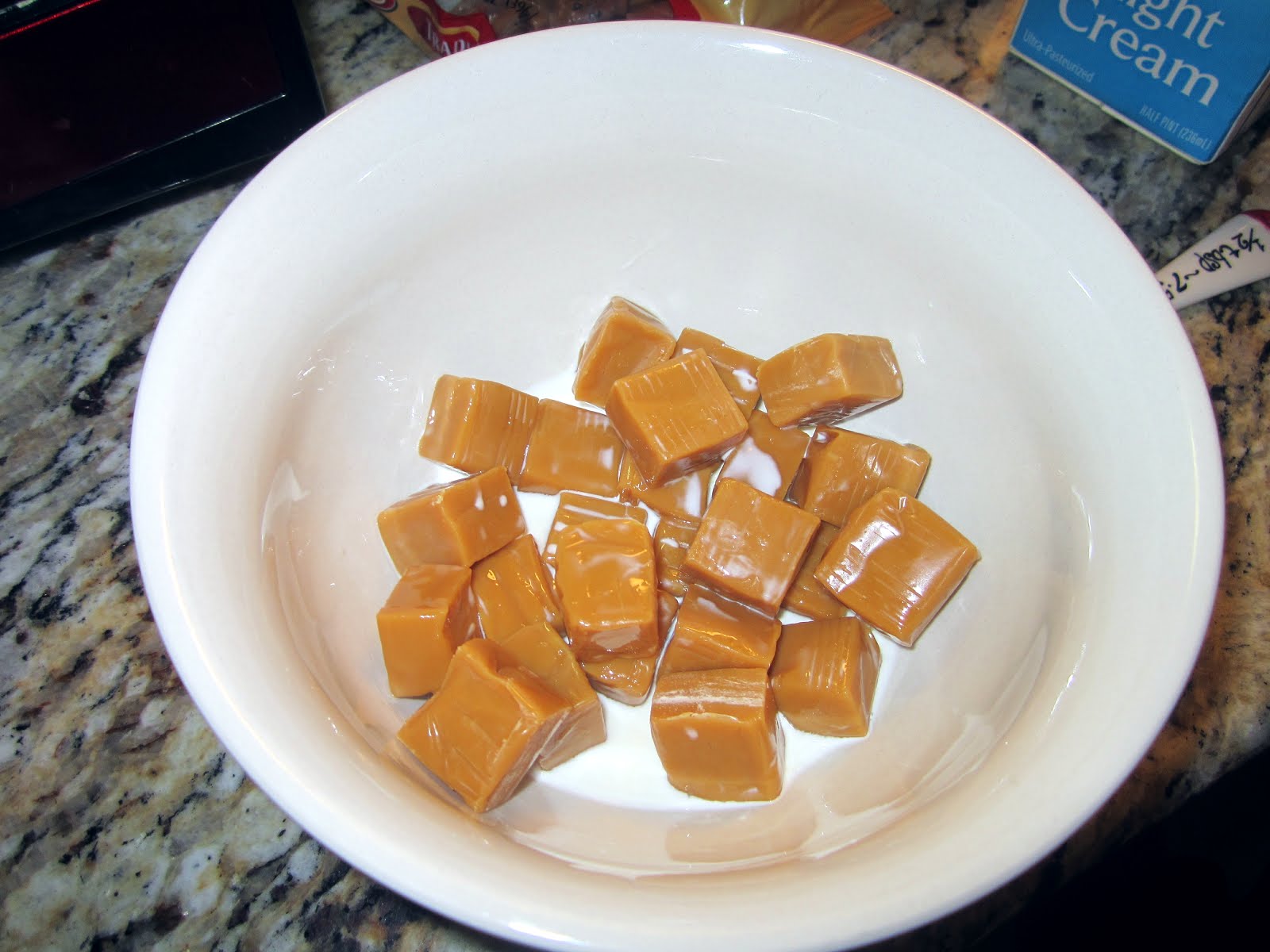 In a large microwave safe bowl, combine the caramels and cream. Microwave on high until caramels are melted, stirring every 20 seconds (this took me about 3 minutes- the timing depends on your microwave).