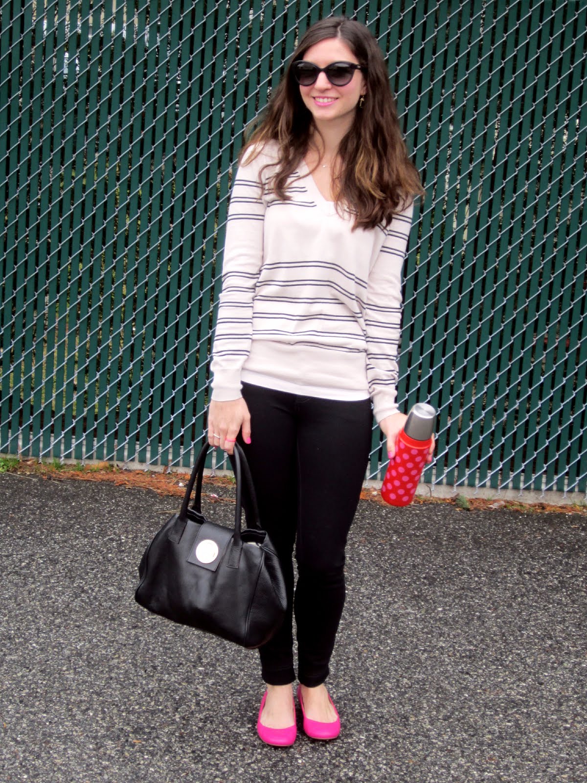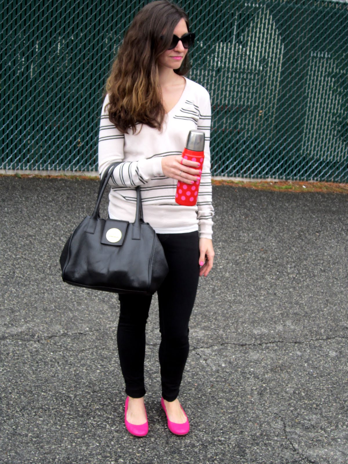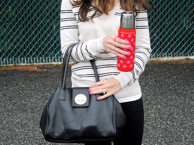 sweater- J. Crew, pants- Kut from the Kloth, shoes- J. Crew, bag- Kate Spade, sunglasses- Kate Spade, rings- Madewell, earrings- Anthropologie, thermos- Kate Spade (thanks Tara!)