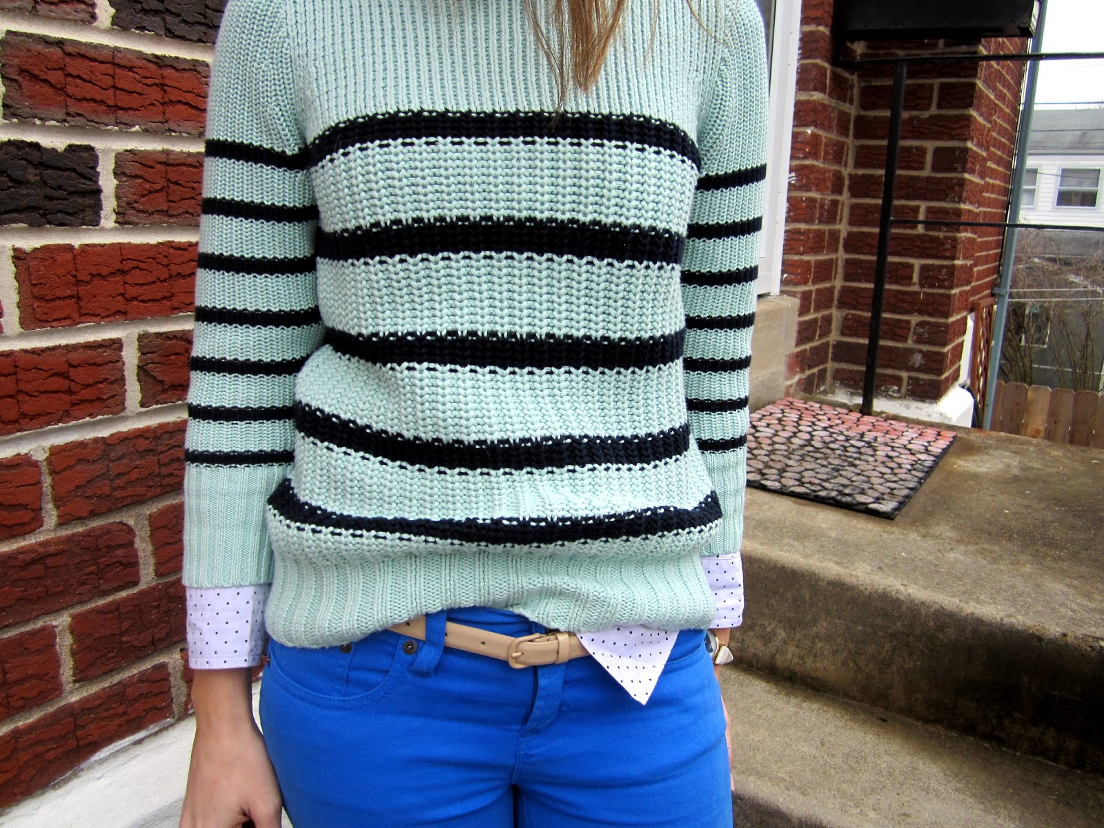 Here I combine cobalt, mint, (yes, again) and lavender- three of my favorite colors for spring… is it spring yet? The sun is out today and every time I look outside I keep thinking it’s going to be warm… and it’s not 🙁 So, since it’s still sweater weather, I paired my new polka dotted lavender button down with this sea-colored navy striped sweater (and, of course, the pop of cobalt). I think that the shades of blues and greens remind of the ocean and summer… which is probably why I keep working them into my outfits. What reminds you of warmer weather?