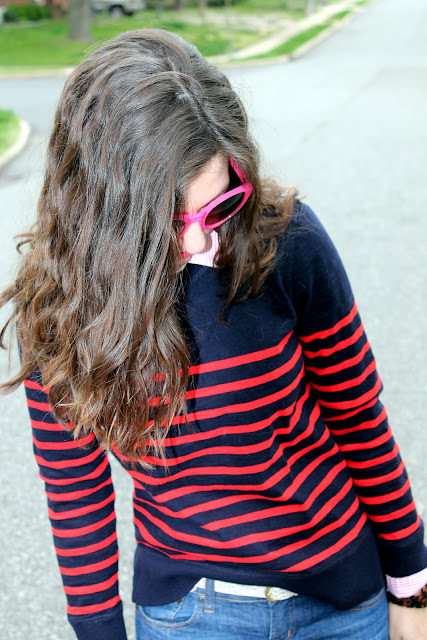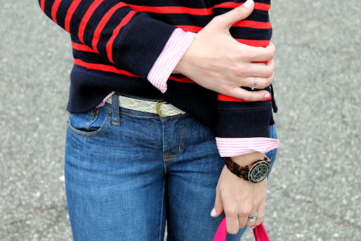 jeans- J. Crew, sweater- J. Crew, shirt- J. Crew, belt- J. Crew, flats- J. Crew (see them in yellow here), bag- Kate Spade, watch- Fossil (similar one here), sunglasses- Quay via Nordstrom (I love these fuschia ones too!)