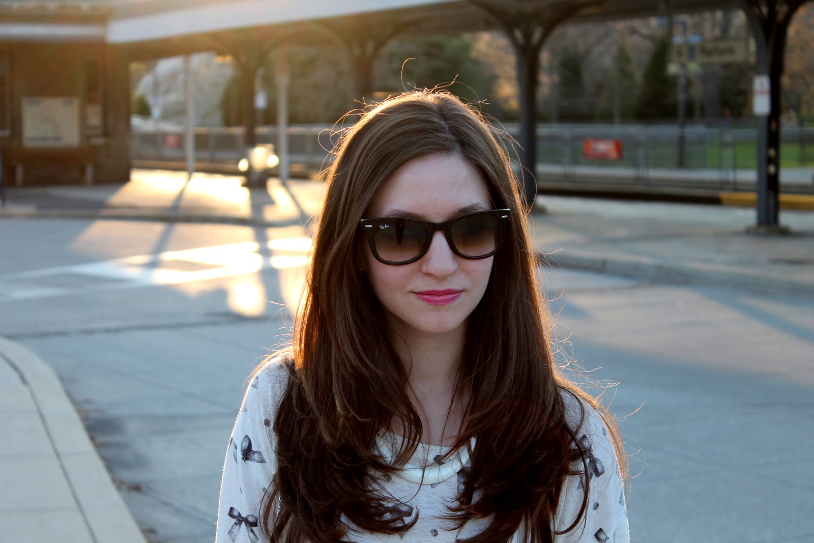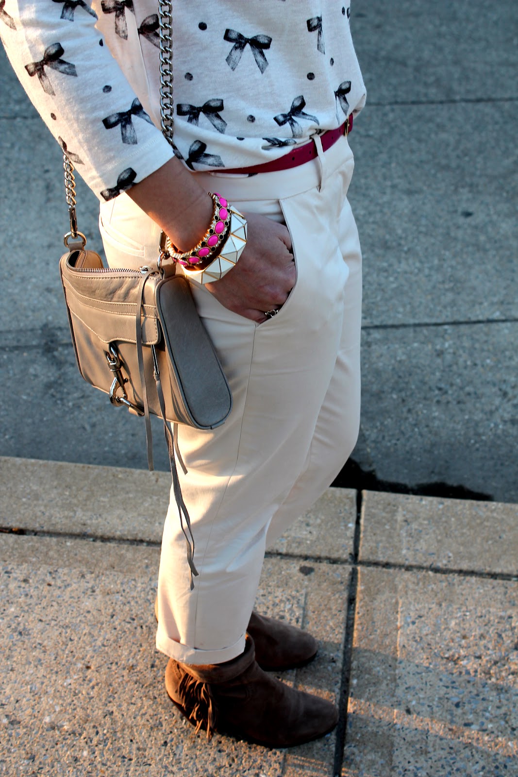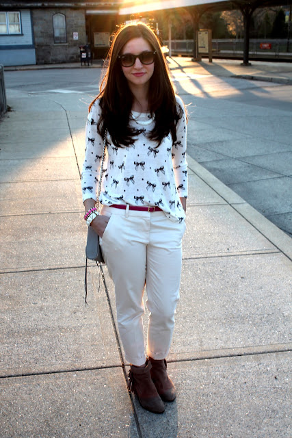 pants- J. Crew, top- Madewell, belt- J. Crew, booties- Sam Edelman, necklace- Forever 21, bracelets- J. Crew & Forever 21, sunglasses- Ray-Ban, lips- Bobbi Brown rich lip color in Cosmic Raspberry