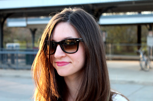 pants- J. Crew, top- Madewell, belt- J. Crew, booties- Sam Edelman, necklace- Forever 21, bracelets- J. Crew & Forever 21, sunglasses- Ray-Ban, lips- Bobbi Brown rich lip color in Cosmic Raspberry