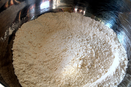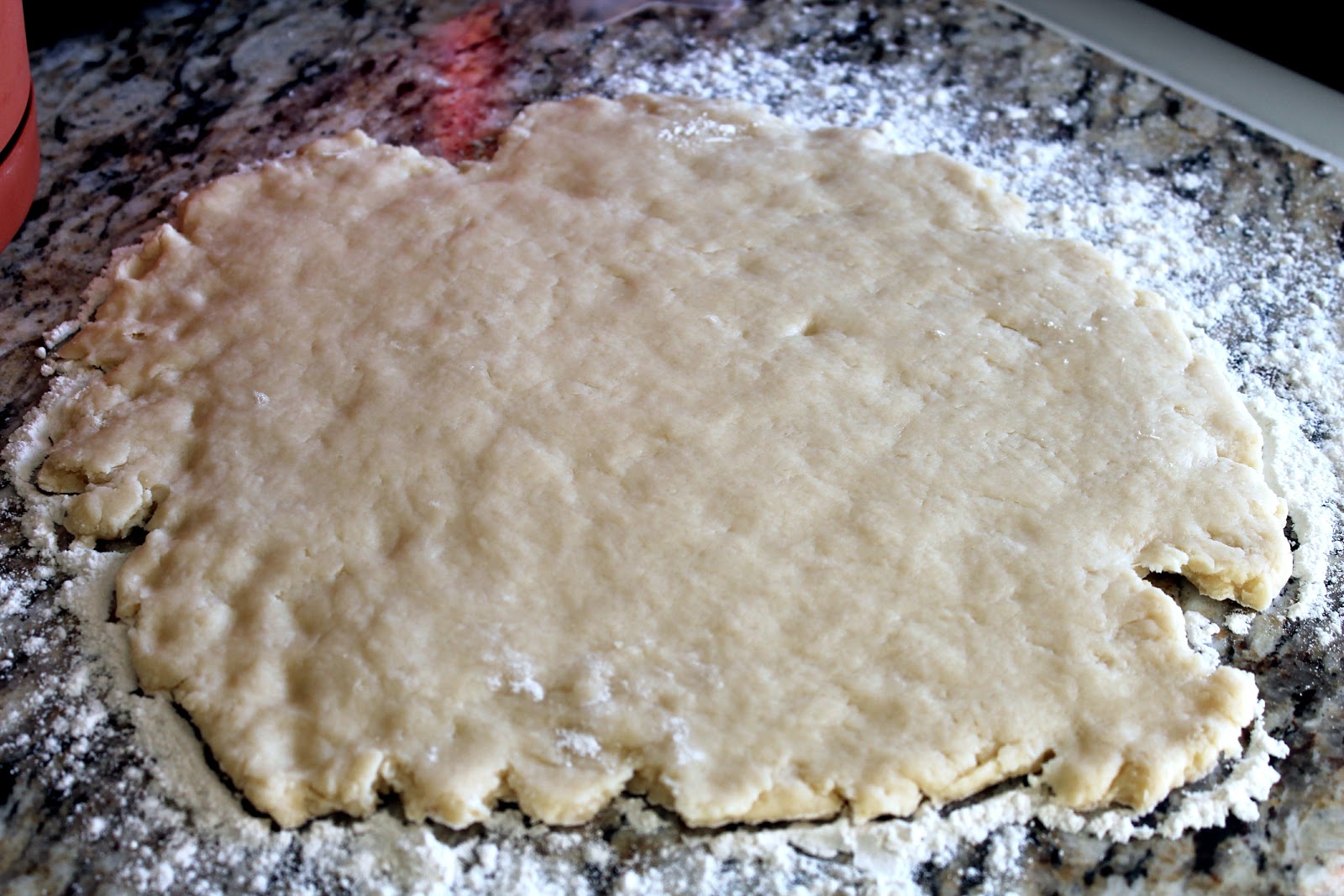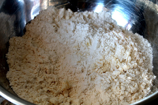 Combine the flour, sugar, baking powder, and salt in a medium bowl. Then cut in the butter and cream cheese until the mixture is crumbly (the second picture is how mine looked after this step). Add the cream and stir just until the ingredients are moistened.