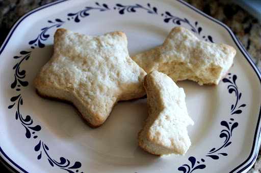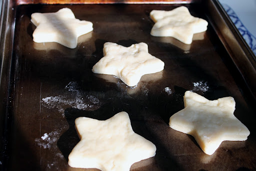 Turn out the dough onto a lightly floured surface and then roll (or pat) the dough until it is about one inch thick. Cut the scones using a 2 1/2 inch round cookie or biscuit cutter (I didn’t have one so I used a star cookie cutter… I thought they turned out really sweet!). Place scones on the prepared baking sheet, brush tops with the remaining cream, and sprinkle with turbinado sugar.