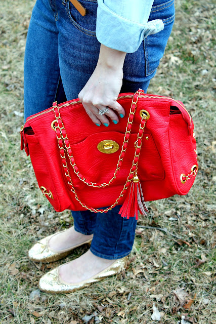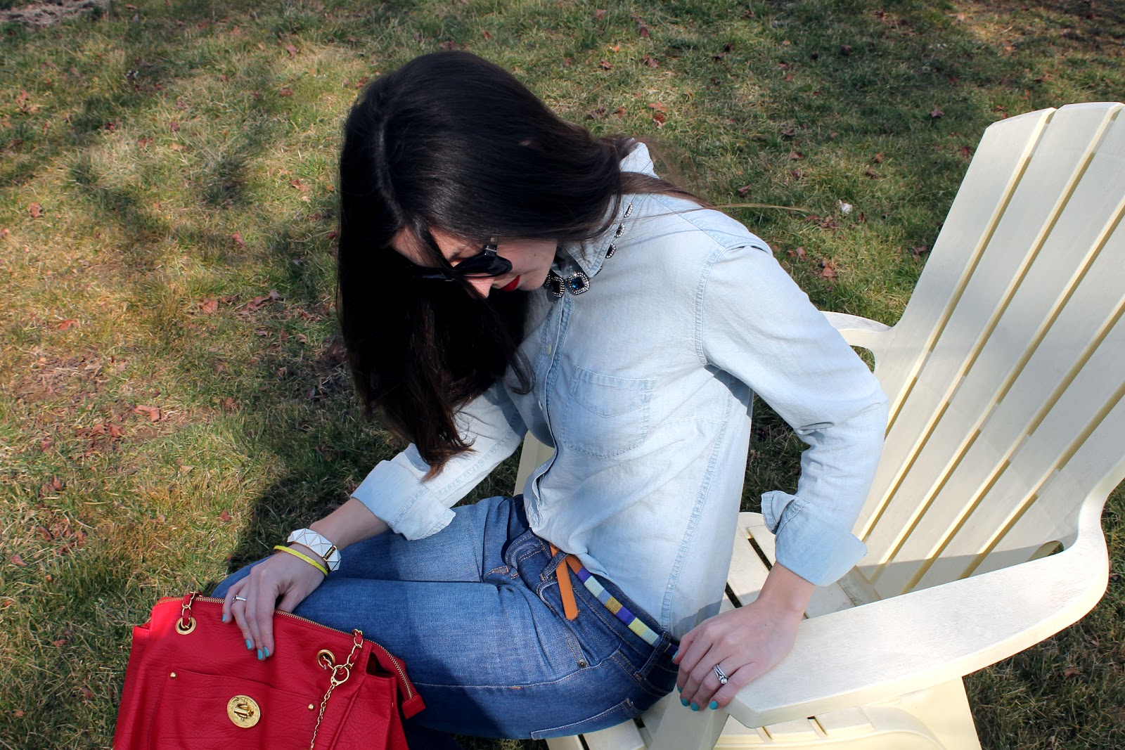 I know I told you I wanted to try denim on denim soon… so here’s my first attempt! I think it works here because the chambray is so much lighter than the color of the jeans… also, the belt helps to break it up 🙂 I threw in a red bag to go with my new red liquid lipstick from Stila in beso… love it! I have seriously worn it every day since I bought it on Friday.