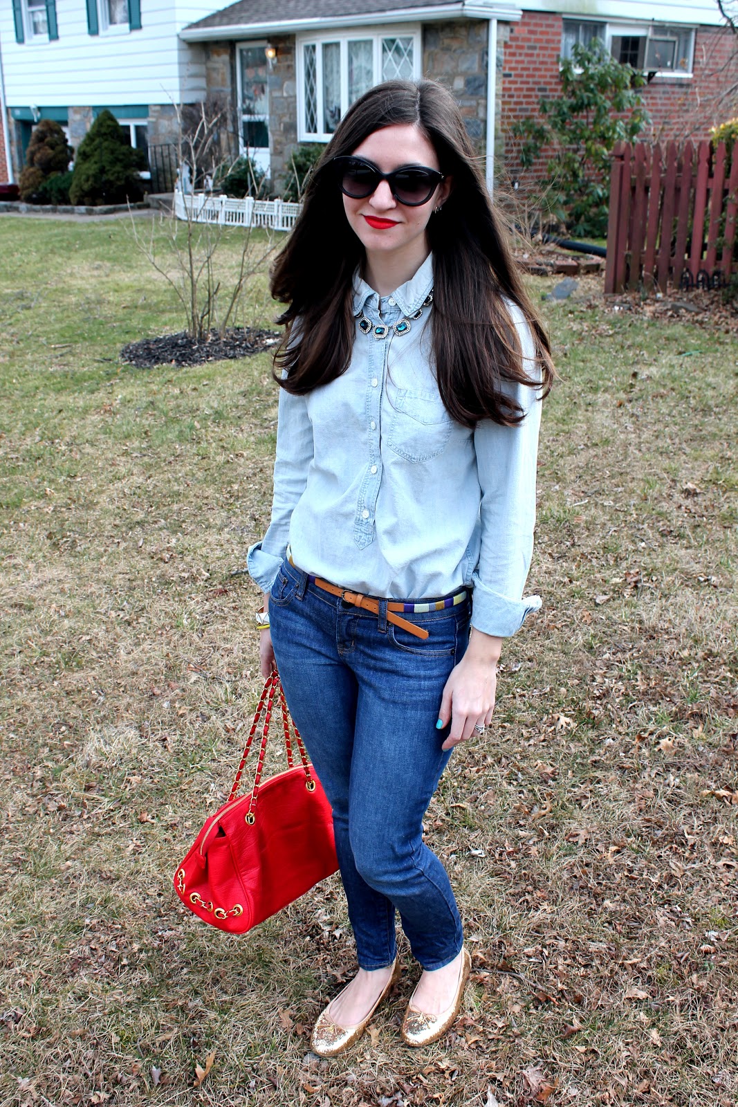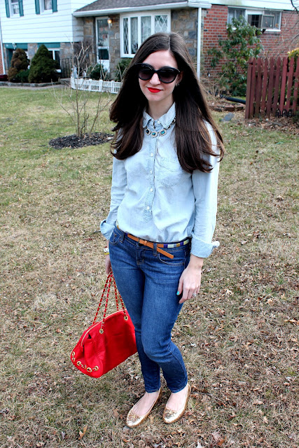 jeans- J. Crew, top- J. Crew, flats- Sam Edelman, belt- J. Crew, necklace- Forever 21, bag- Avon (old), bracelets- J. Crew and Forever 21