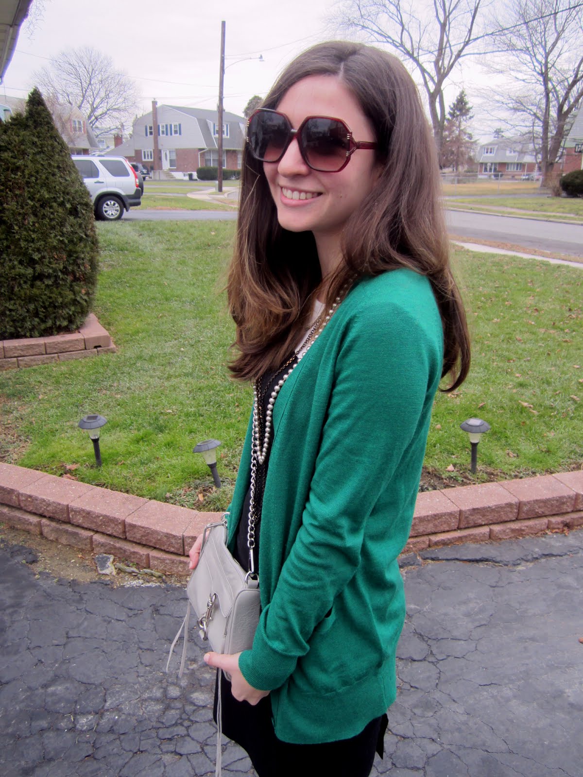 Today was a lovely day. Aside from the fact that green is my favorite color and my post today involves a big dose of emerald, I was able to bake something that involved both salted caramel AND chocolate (to be posted at a later date), I went to the bookstore (one of my favorite places), and Joe bought me a surprise gift (also to be showcased at a later date!)! I added the green cardigan here to brighten up the black on black, the pearls to class it up a bit, and the vintage looking sunglasses both to add to the vintage feel of the look and for another pop of color (I love the burgundy!). I thought the loafers helped to dress it down and worked as an unexpected piece. I also paired my Rebecca Minkoff bag with this (another gift from Joe) because the color is similar to the pearls I’m wearing… and because I’m in love with this bag.