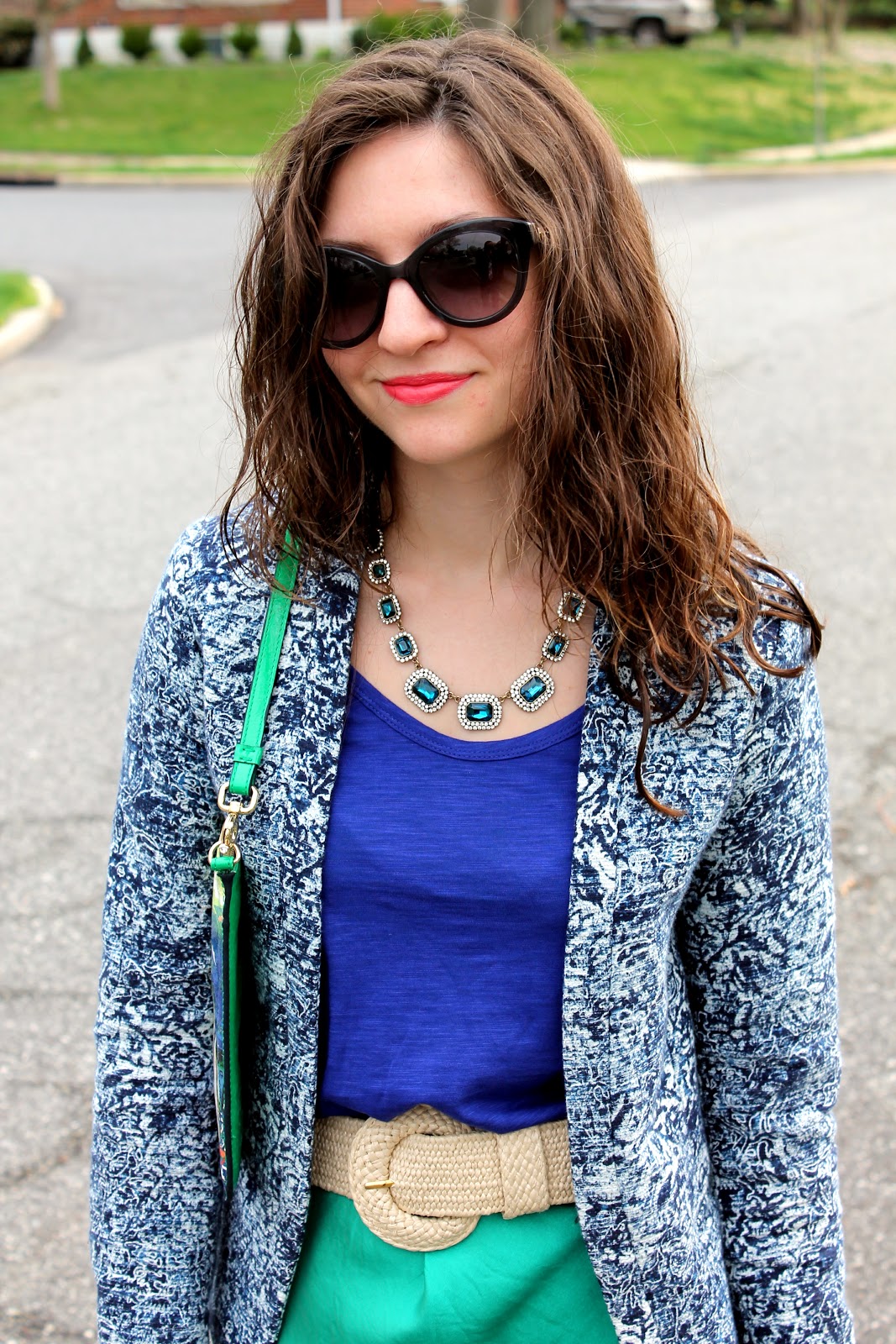 dress- Heritage 1981, top- J. Crew, blazer- H&M, belt- Lilly Pulitzer (I love this belt, too), flats- Sam Edelman, bag- Juicy Couture, necklace- Forever 21, bracelet- Bedazzled Boutique, sunglasses- Kate Spade