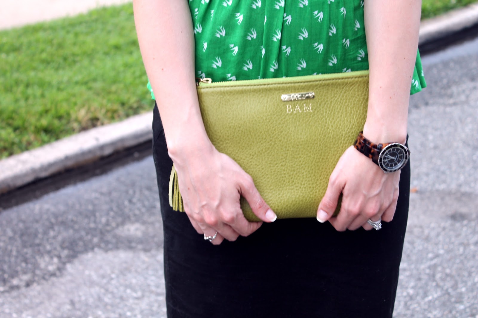 I love the peplum detail and the pleated front on this top. Usually, it’s the details that get me… I always get roped into making a purchase if something has a cute bow or pretty floral pattern or some other sweet little detail. I think it’s the details that really make a piece special… like the monogramming on this clutch! I also love monogrammed items, in case I haven’t mentioned that already 🙂 This chunky beaded necklace is great, too, because it pulls together all the elements of this outfit: the green and black of the top and skirt, the lime color of the bag, and the metallic tones in the wedges. It’s one of those pieces that can either stand on its own or tie everything together, a wardrobe workhorse!