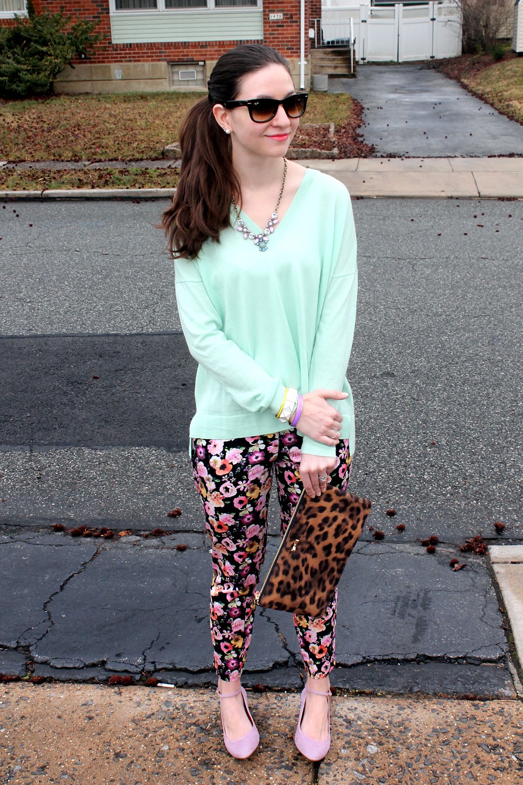 1. Since I’ve already done a striped top (stripes look great with florals!), I decided to change up the color scheme (I used rose and gold for winter) and pattern play for a totally different look. This time, I opted for a spring color palette in pastels and started with a solid colored, mint green sweater. 2. I then chose my shoes- lavender-hued ankle strap flats to both freshen up the look and to bring in another pop of color! 3. To pull it all together… the jewelry and the bag. I chose a statement necklace with similar colors as the top and flats and threw on some brighter colored bracelets for some added punch. I also added a leopard clutch because I think that leopard counts as a neutral… and I love florals and leopard together!