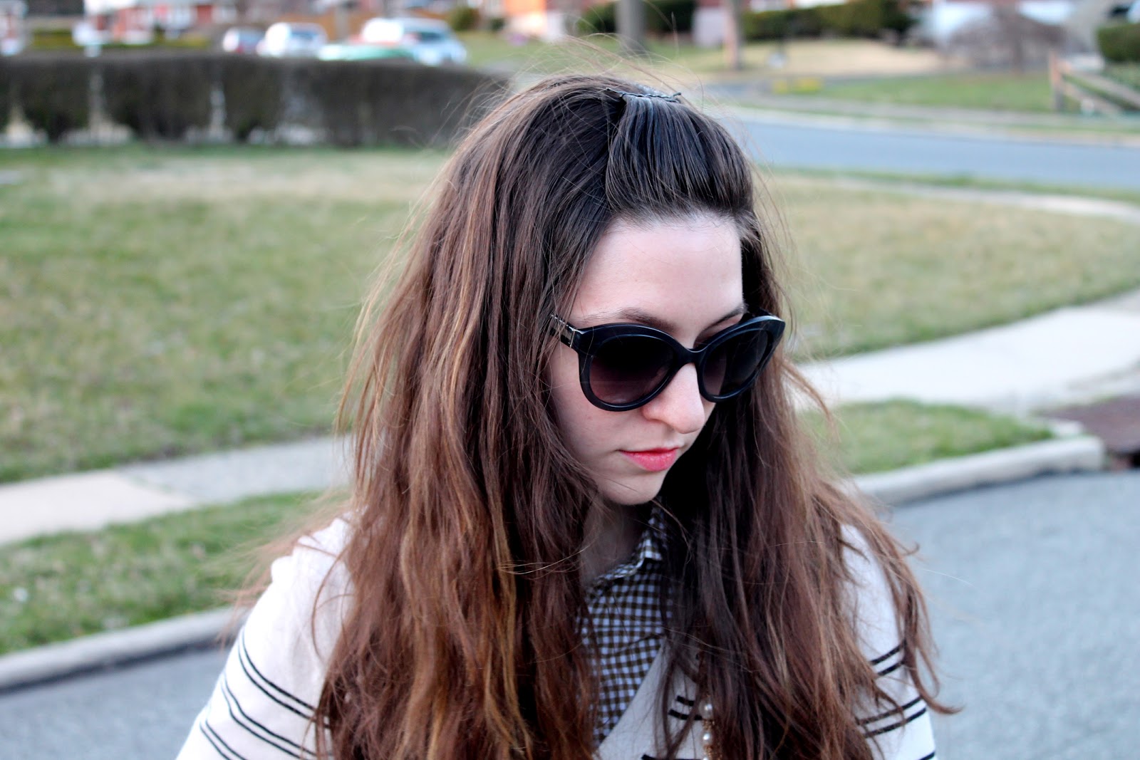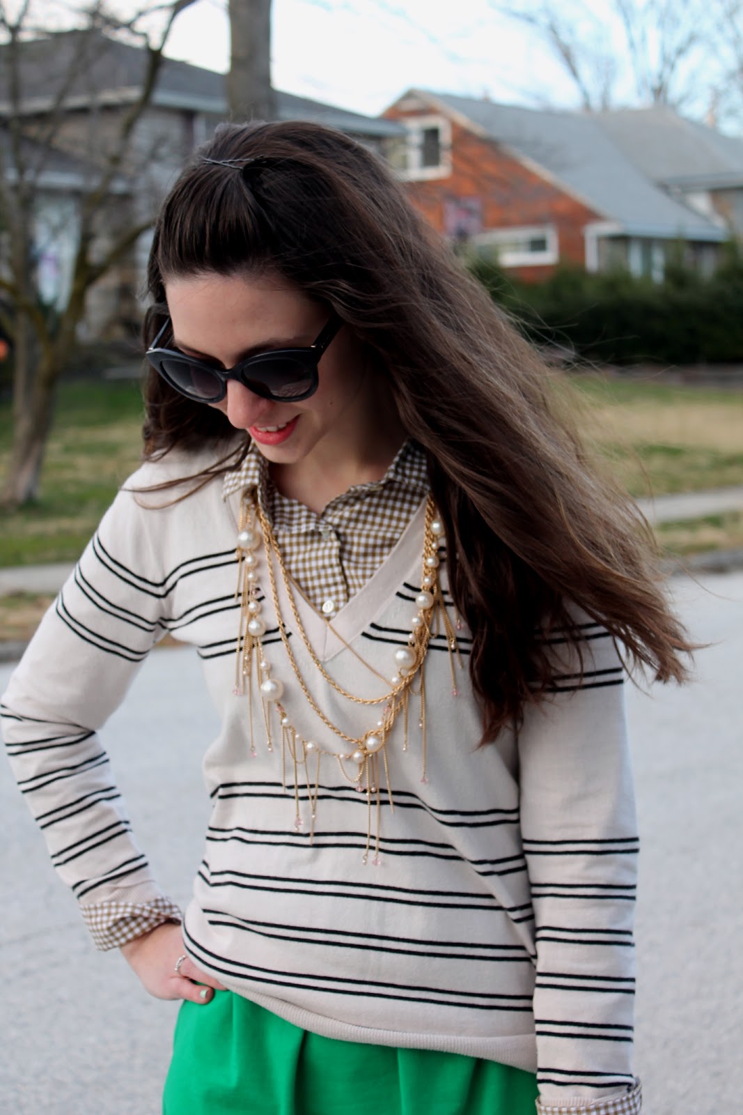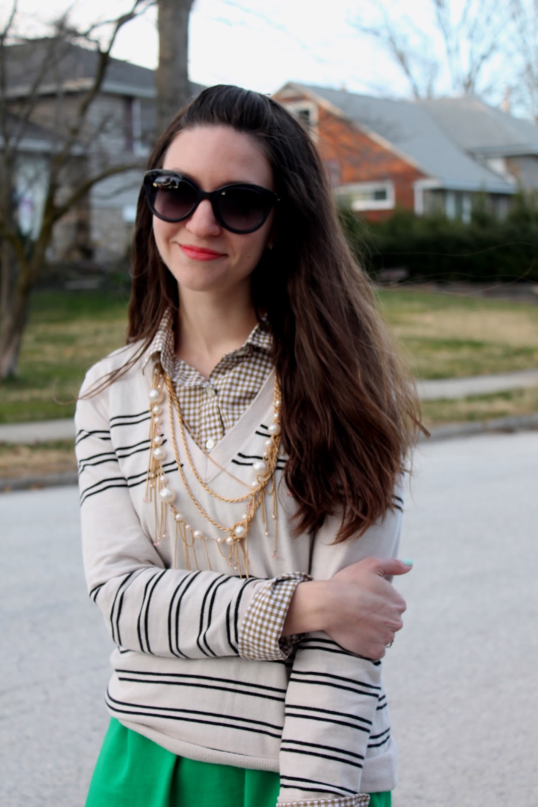 What looks like a skirt in this picture is actually one of my summer dresses 🙂 (don’t you just love the emerald green color?) I’ve come to the conclusion that the end of a season breeds the most creativity (at least when it comes to dressing) because I’ve already worn pretty much everything in my closet for that particular season at that point… and am sick of looking at most of it! So, here’s my latest outfit for the awkward in between weather that always comes with the change of seasons. I’m still trying the brighten my mood with fun colors and patterns, hence the gingham top and green dress (and my fun mint green mani)! Would you try wearing a dress as a skirt?
