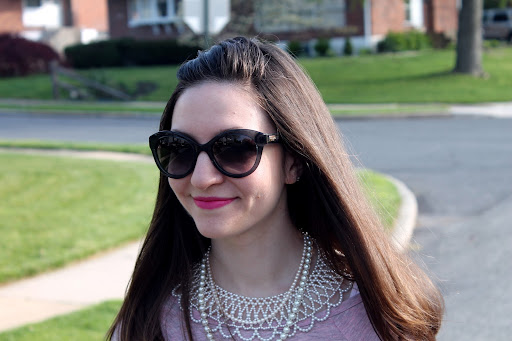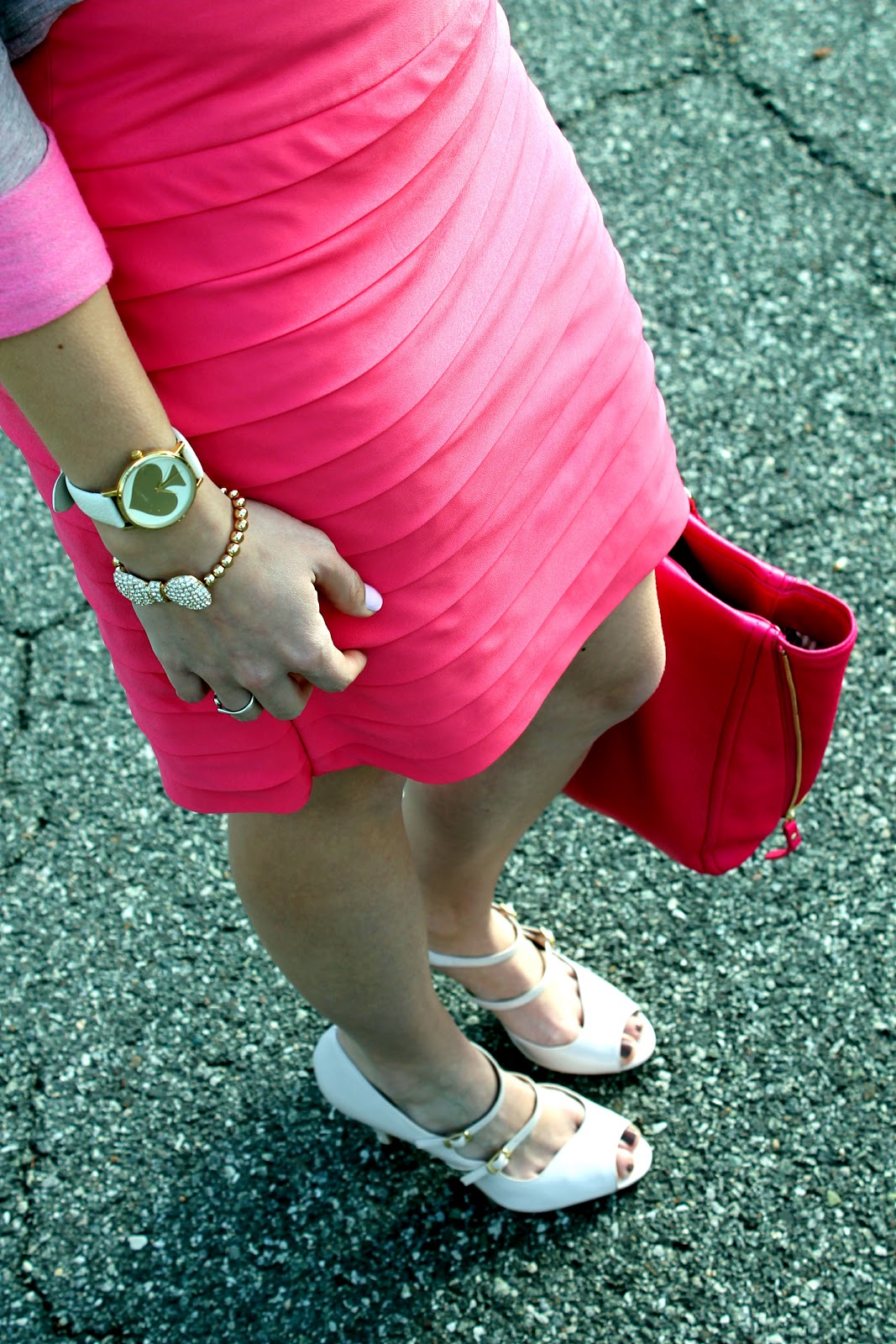 skirt- Target (old), sweater- Target, heels- Target (old), bag- Kate Spade (on sale now!), pearls- vintage (collar), Tiffany & Co. (small), Claire’s (large), bracelet- Bedazzled Boutique, watch- Kate Spade (similar, on my wish list), sunglasses- Kate Spade, lips- Bobbi Brown rich lip color in Cosmic Raspberry