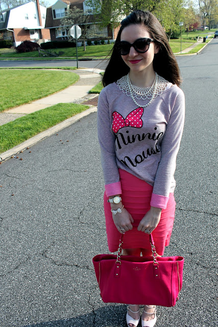 I found this top for less than $6 at Target (love Target!) so, naturally, I had to buy it. I also just so happen to love pretty much everything Disney 🙂 I wanted to wear this with as much pink and pearls and other such girly items as I could… as a tribute to Minnie’s eternal femininity of course… hence the ruffles on my (pink!) skirt, the bright pink bag, light pink heels, and bows and multiple strands of pearls! And who could forget a pretty and ultra feminine pink lip? In case you couldn’t tell, I try not to take myself (or getting dressed) too seriously… sometimes you just have to have fun with what you’re putting together 🙂 After all, fashion/what you wear is essentially an extension of yourself… so I like to show some creativity when I can!! Do you have outfit or an idea for one that expresses your personality?