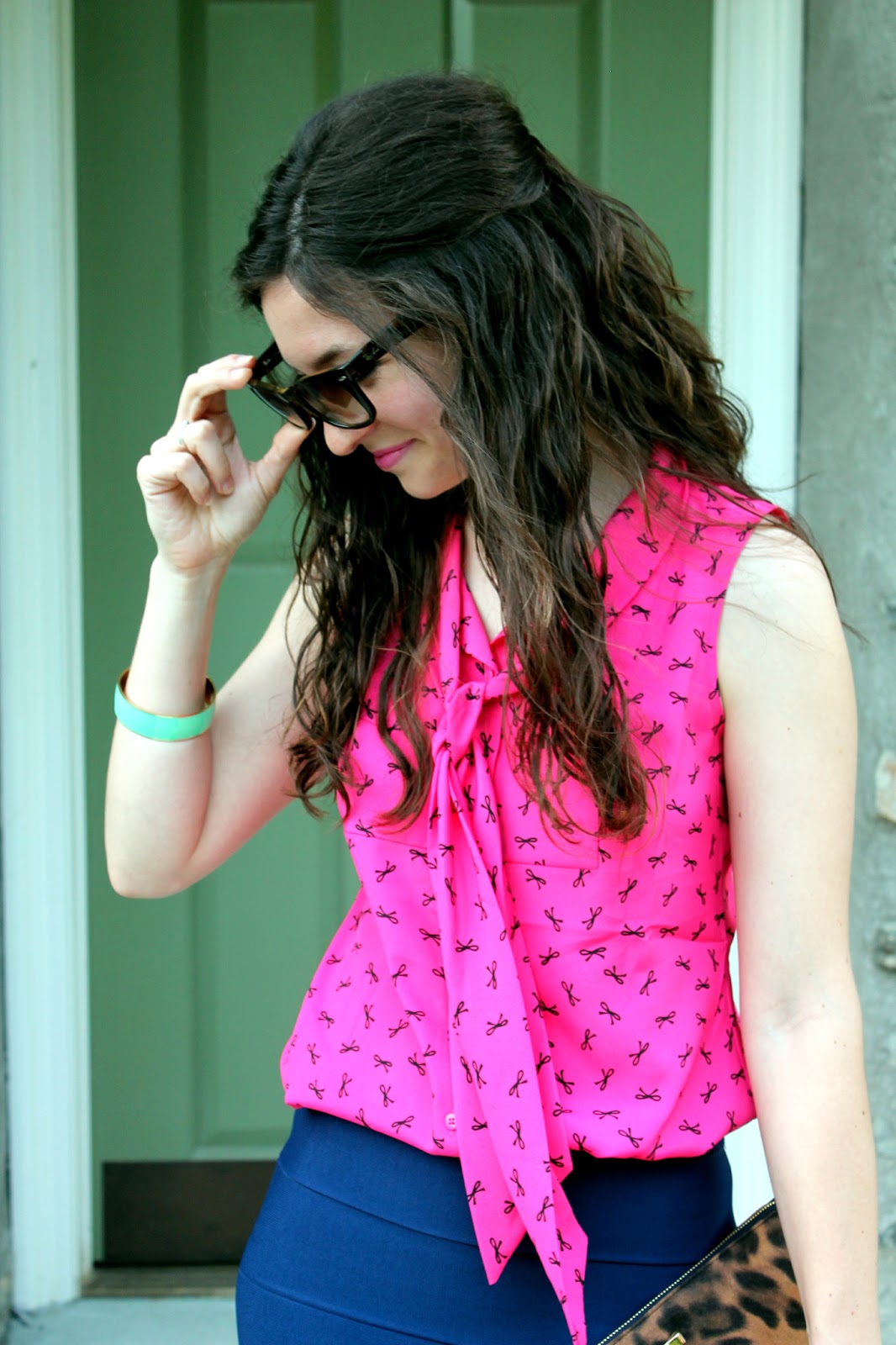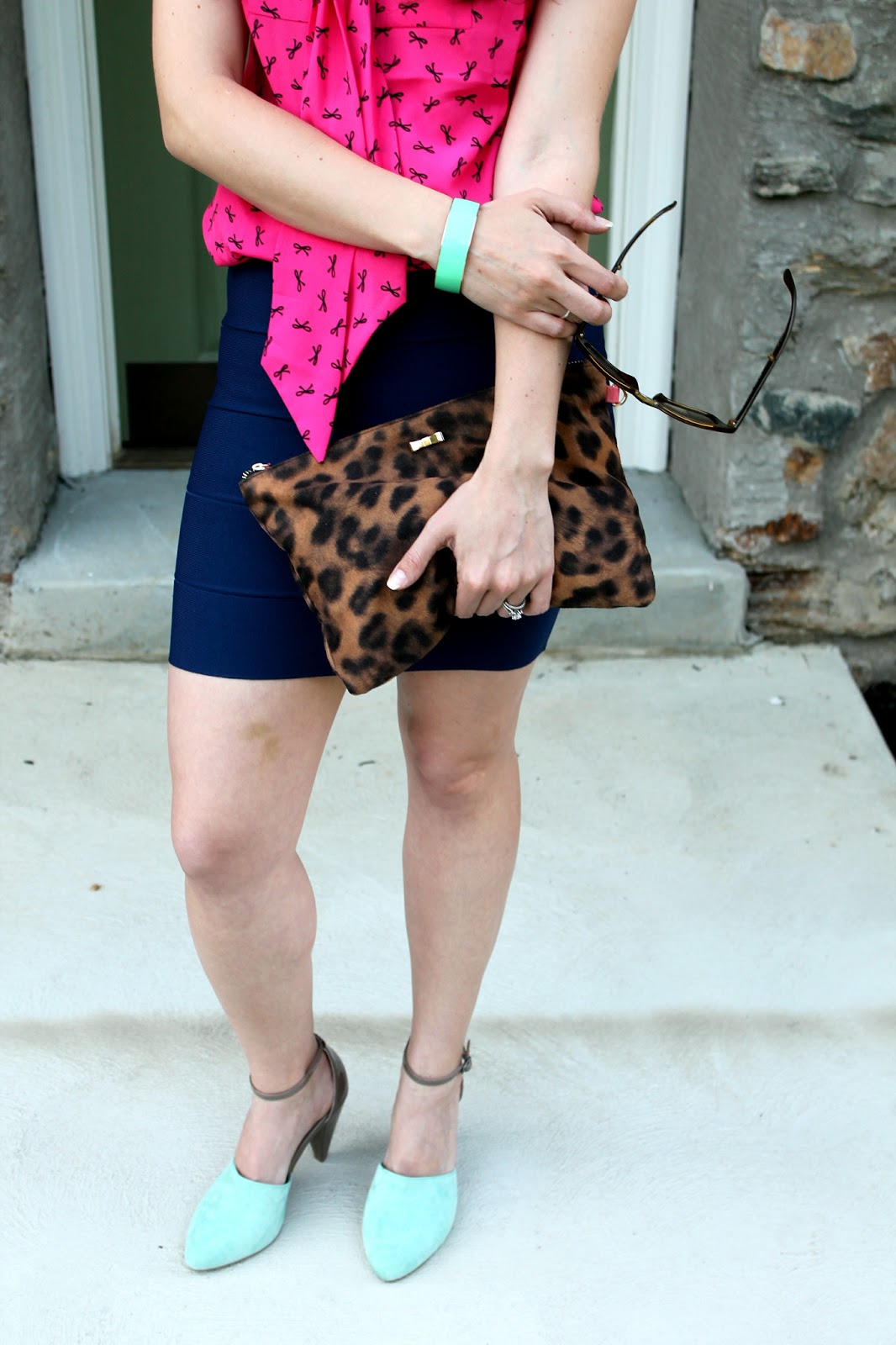 I love this bandage skirt from BCBG! It is so flattering, and surprisingly comfortable! I also love the combination of navy and pink (and the sweet little bows on this blouse!)! I’ve always loved bright colors but I’ve been trying to be a little more bold with my color combinations lately, a perfect challenge for the summer! I’m really liking the aqua and mint with the bright pink anchored by the neutral navy skirt and leopard clutch. What color combinations have you tried lately or what are you excited to try this summer?