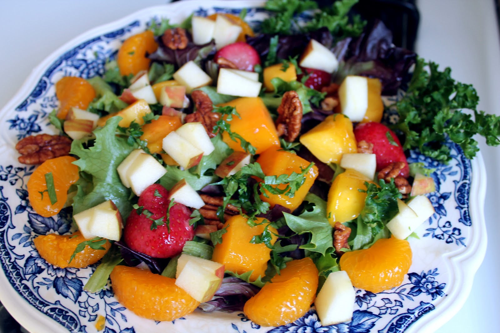 Wash lettuce and dry well. Layer spring mix first and top with fruit and then the pecans. Add the fresh parsley (or any herbs you like) last. Pour dressing over the top, mix, and serve.