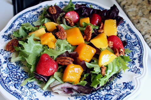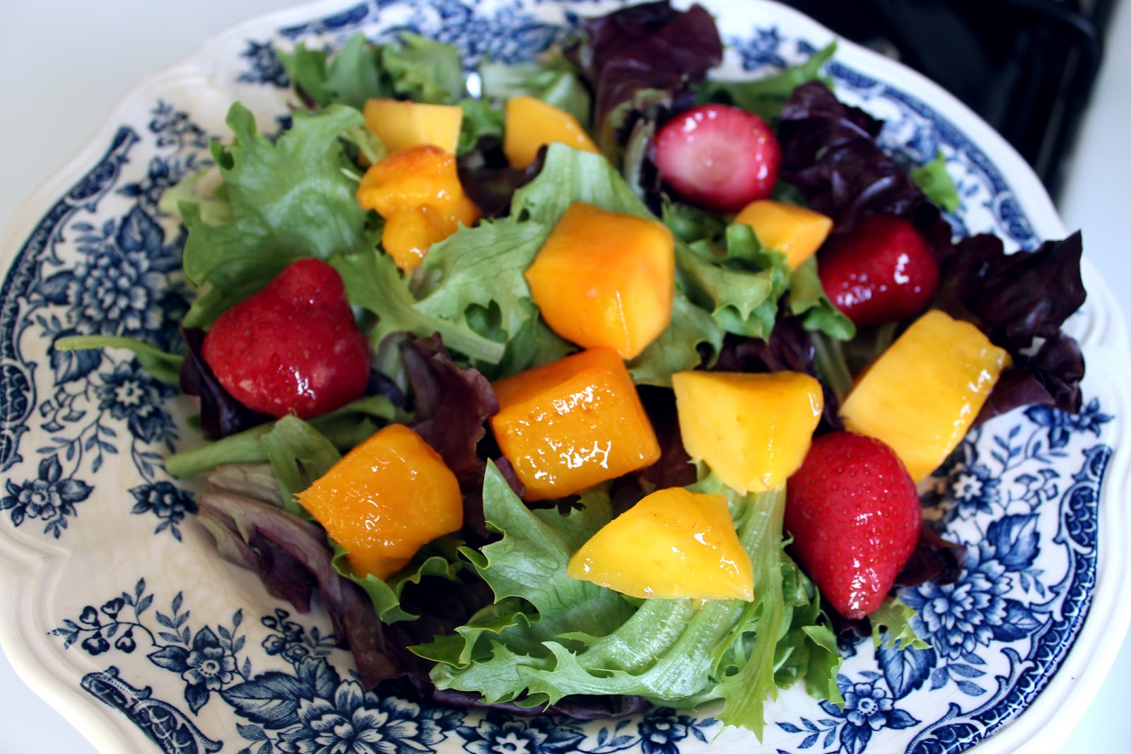This is a really good salad to have for lunch, as a side at dinner, or in bulk for parties… I like to make this for lunch or dinner a lot because it helps me get my daily servings of fruit, which I have a hard time getting otherwise… I will usually pick up a granola bar as a snack before a banana or a handful of berries… it’s just easier for me. I also want to note that because of this, I try to keep frozen fruit in my freezer (I somehow always seem to forget that I have fresh fruit when I do buy it so it ends up going bad) and that I used frozen strawberries and mangoes in this salad but I’m sure it would be better with the fresh version! And thanks to my lovely friend (and avid gardener), Sarah, I have strawberry plants blooming in my garden right now!!