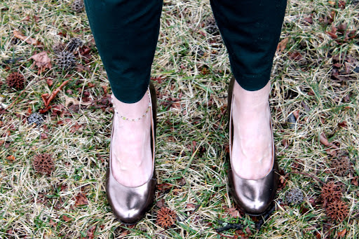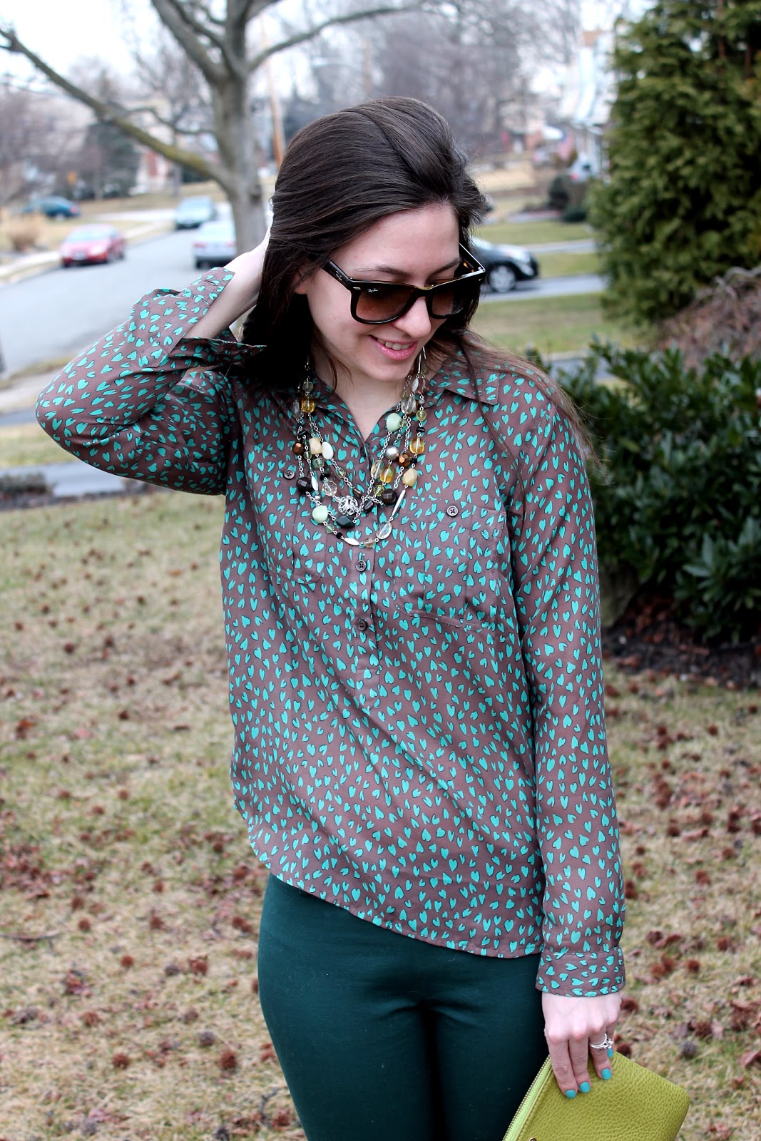 Anyway, I chose this top because the blue-green shade of the hearts compliments the green in the pants and necklace (believe it or not, I styled this outfit around this necklace… it is one I’ve had for a while but I love it because it is such a pretty combination of colors and it is so versatile!).