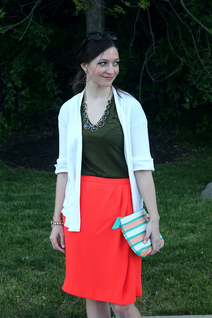 This is a color combination that never really crossed my mind until I was trying to find something to pair with these heels that I haven’t worn in forever… there are threads of a pink-ish color running through these shoes so I thought I’d try them out with this bright skirt and, luckily, it worked! I have more bold colors in my closet than neutrals so I’m always trying to think of different color combinations so that I can keep changing up the look of a particular piece (remember this look?). Do you have any go to or unique color combinations that you love?