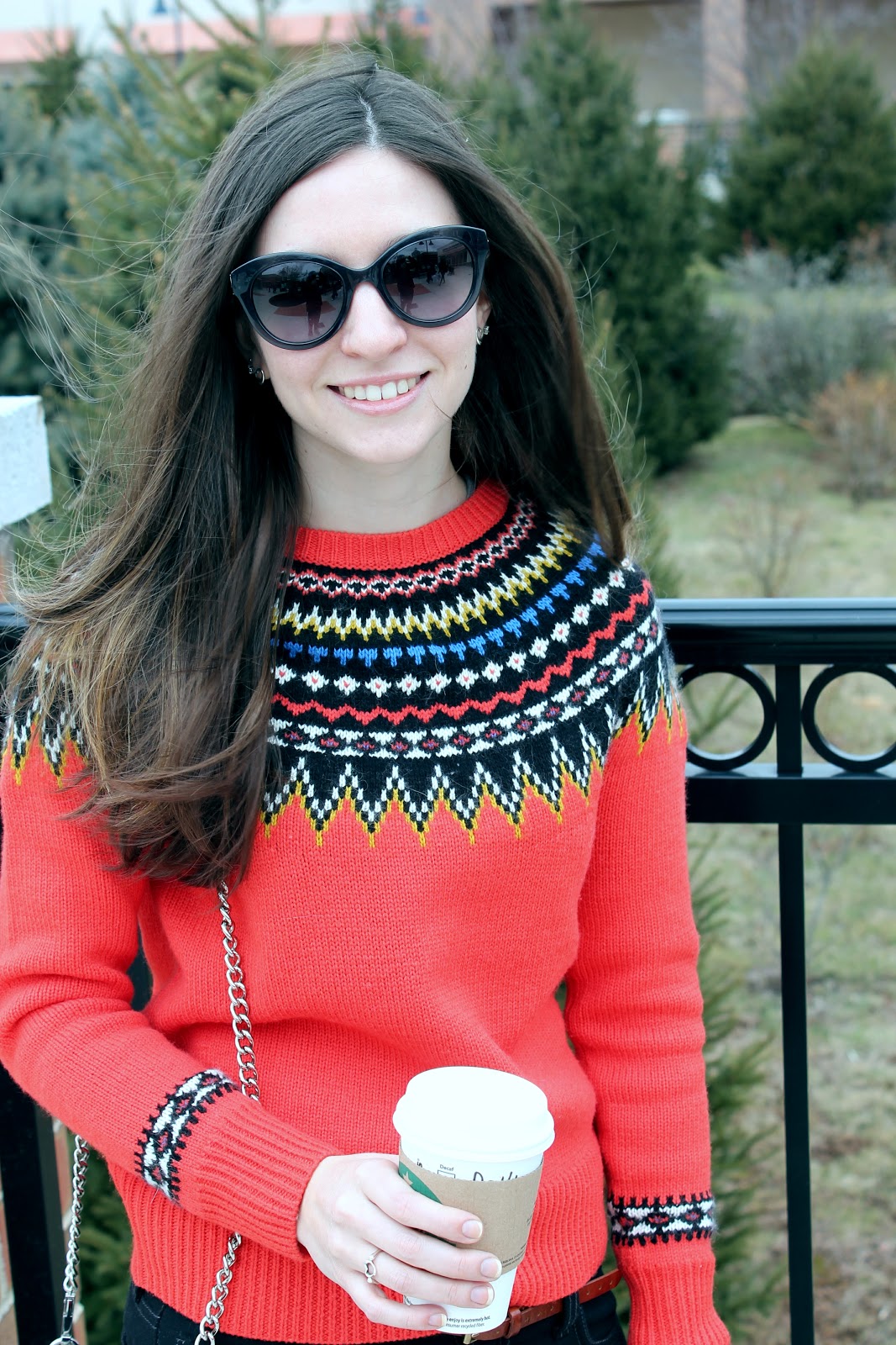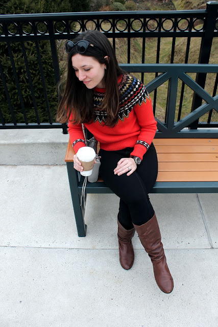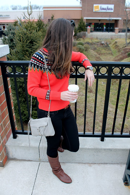 I love this sweater… it is really warm and there are so many gorgeous, bright colors in it. Pairing it with these black pants (which are super comfortable and perfect for a day of shopping) really made the colors pop. I also love wearing black and brown together… I think it is unexpected but classic (if that makes any sense). I also kept my accessories really simple here for a few reasons: 1. the pattern on this sweater is super bold, 2. I don’t like wearing heavy or clunky jewelry when shopping as it always is more trouble than its worth when trying on clothes, and 3. I’ve been wearing a lot of dainty jewelry pieces lately with maybe a statement piece or two… I think simple jewelry always looks classy and polished.