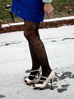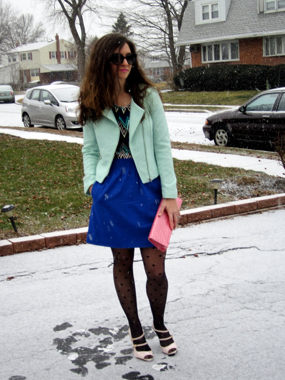 I’ll admit that this is not something I would normally wear on a snowy day… but I didn’t realize that it had started snowing until I was already dressed. I did have to change out of these heels to go to dinner (I swapped them for my black Uggs… a much better decision for the snow-covered ground). This jacket is new from H&M. I love the mint color and the fact that it goes with pretty much everything even though it’s not technically a neutral color. I’ve also been wearing a lot of cobalt lately… another one of my recent color obsessions 🙂