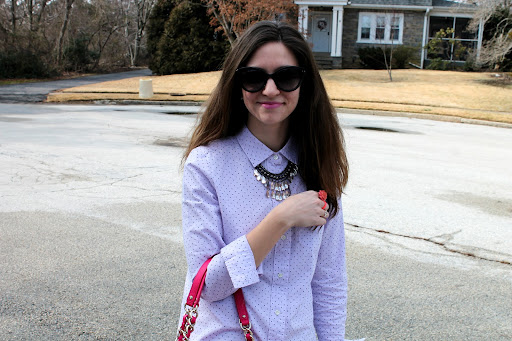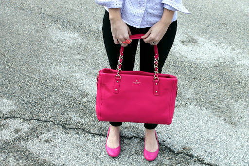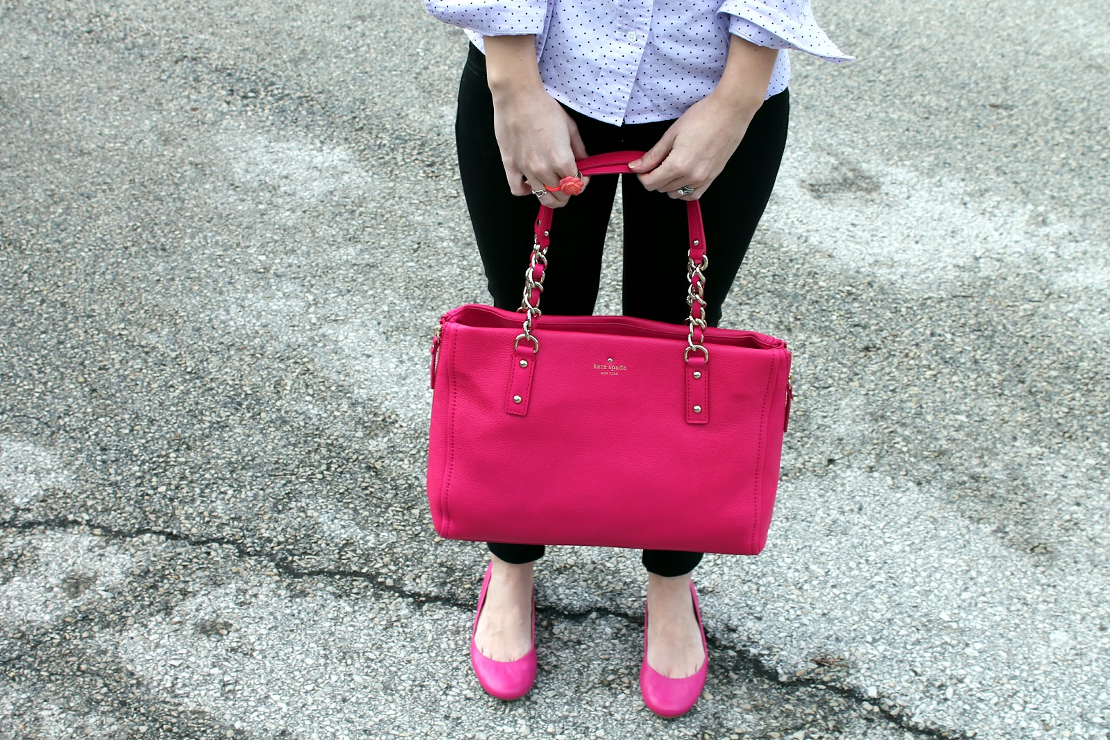 Well, here I am sporting my new Kate Spade tote… love it!! I paired it with my pink flats for some extra punch and a simple polka dotted lavender button down with a pretty statement necklace to up the romance factor. Also, Kate Spade is launching a new line in March called Kate Spade Saturday! Check it out- it is all about fun patterns, bright colors (especially yellow!), and really cool pieces at affordable prices… there are lots of cute sayings too! Saturday is #thebestdayever 🙂