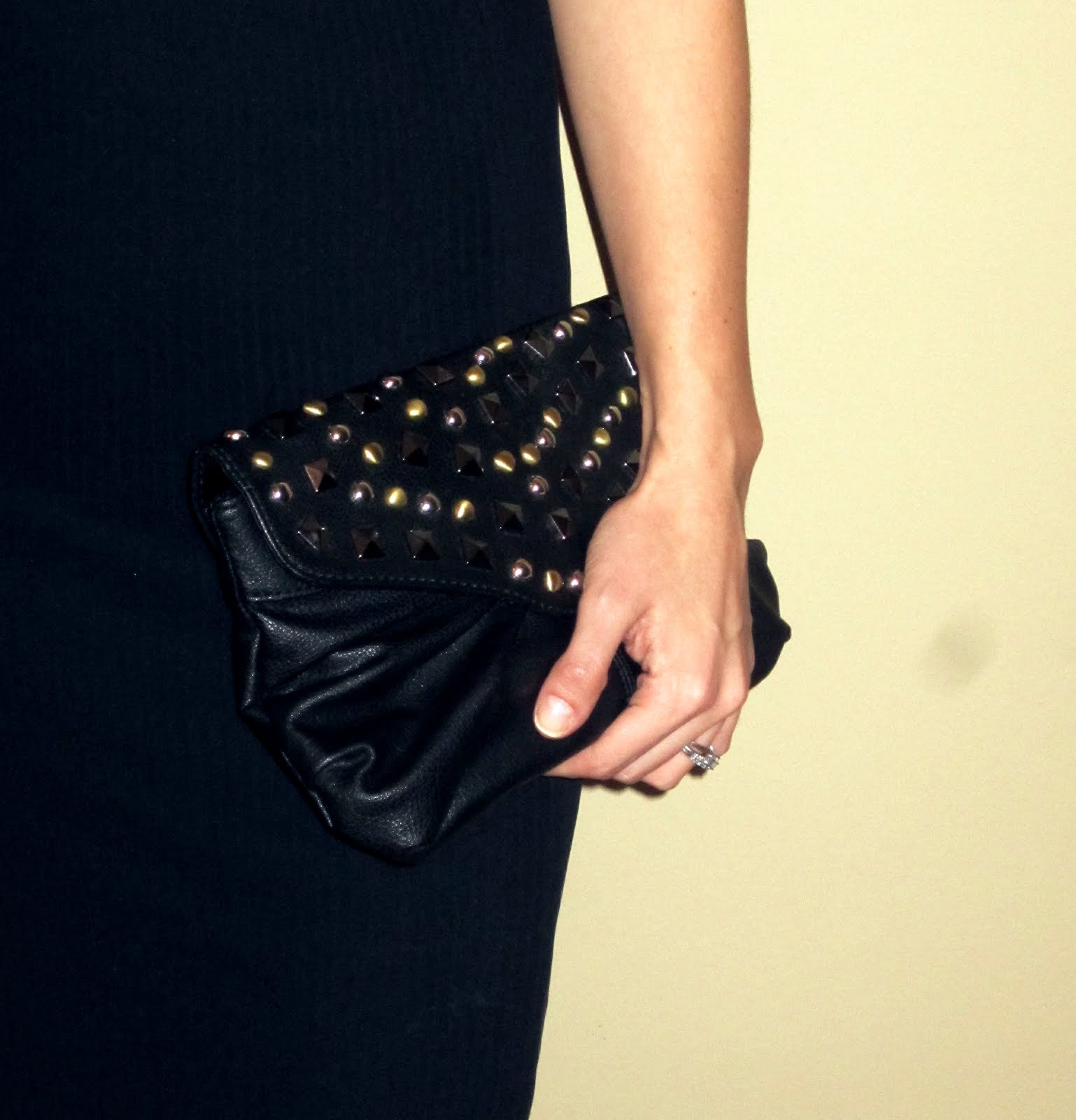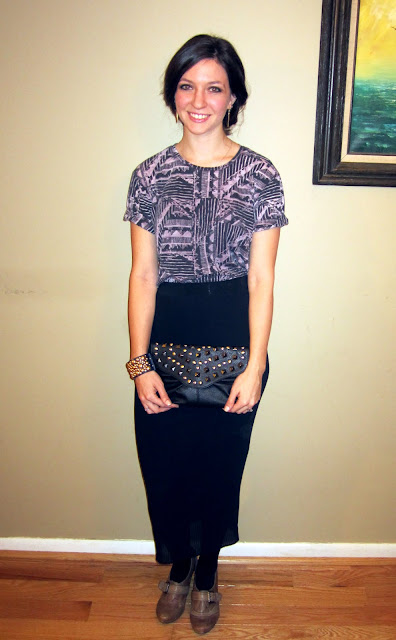 skirt- Anthropologie, tee- Topshop, booties- Nicole, clutch- Express, stockings- old, bracelet and earrings- Bedazzled Boutique