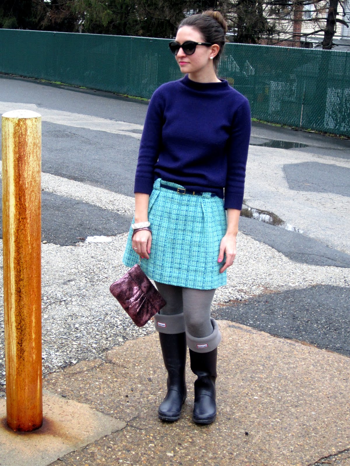 The only bright side of this day was my aqua-hued tweed skirt and that I got to wear my Hunter boots. In case you can’t tell from the pictures, it was rainy and gross outside (just light enough so that we could actually take pictures that day). It was also really cold! All complaints about the weather aside, this is only the second time I’ve worn this skirt and I love it! The colors are much prettier in person and the slight flare is adorable. The first time I wore it I paired it with a cobalt blue top but this time, since it was so cold and I absolutely had to wear a sweater, I chose this eggplant one to pull out the purple threads in the skirt. It also goes with my purple Hunter boots!