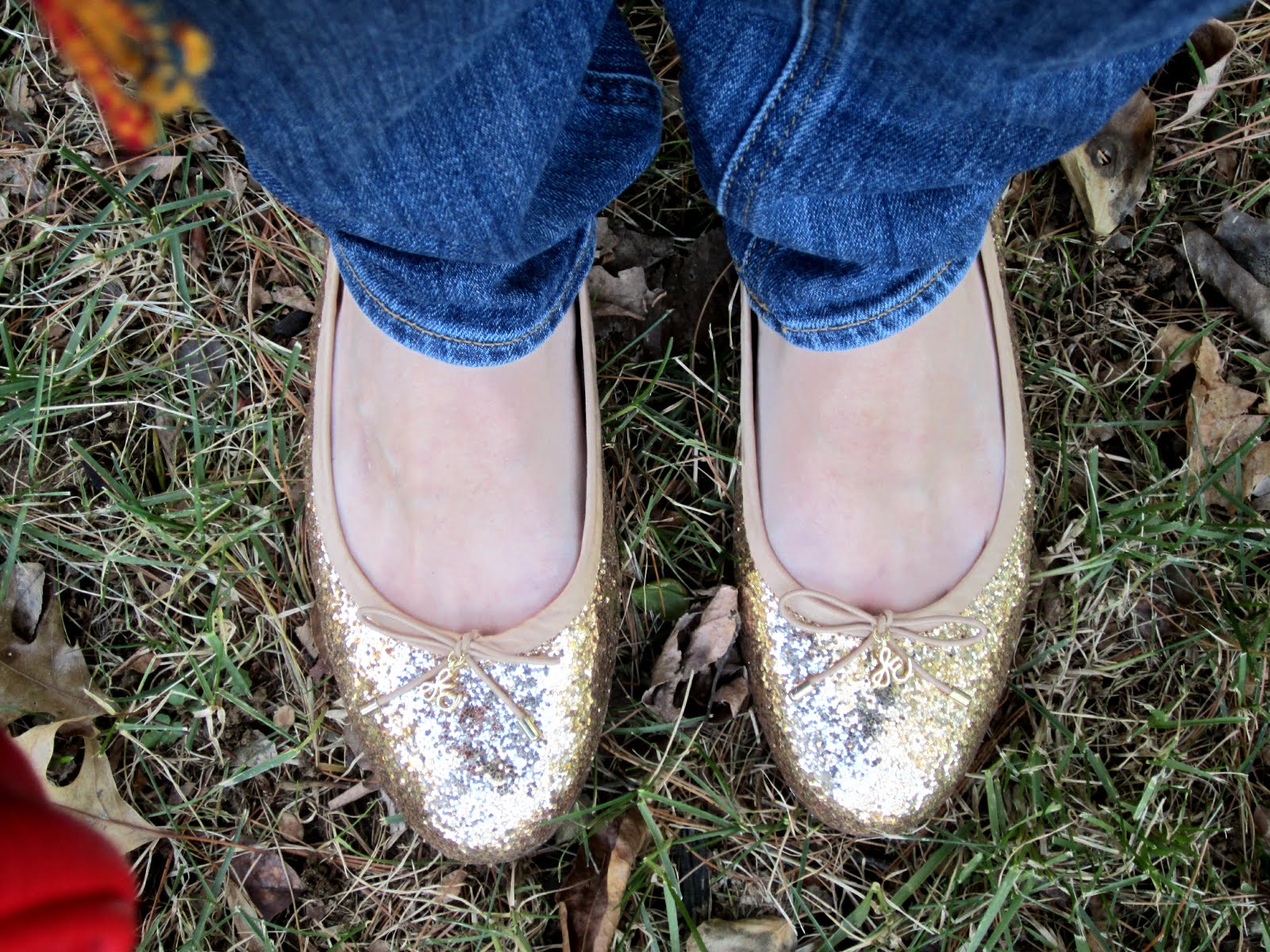 These gold glitter flats were a gift from my grandmother for Christmas… I love them! Sam Edelman’s shoes are gorgeous and they’re so comfortable (this is my third pair!). I am also really liking the color combination here: the red, orange, and gold really complement each other. I tried to play down the dressiness of the gold flats with a thermal top (with gold buttons!) and with a casual scarf and gloves. What would you pair with them?