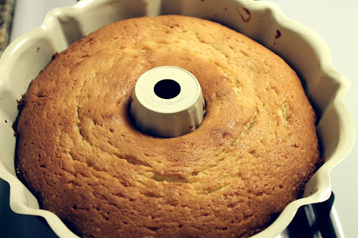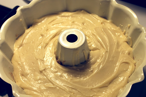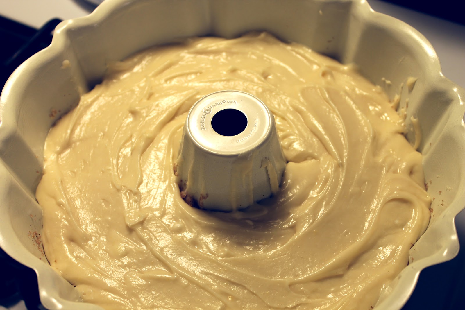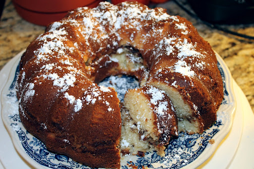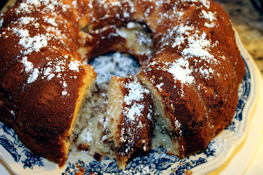 Cream together butter, sugar, and eggs. Add sour cream and vanilla and mix, then fold in the dry ingredients. Spoon half the batter into a greased bundt or tube pan and cover with filling. Add the remaining batter to the pan. Bake for 1 hour at 350 degrees. Let cool in pan for 10-15 minutes before removing. Sprinkle with powdered sugar.