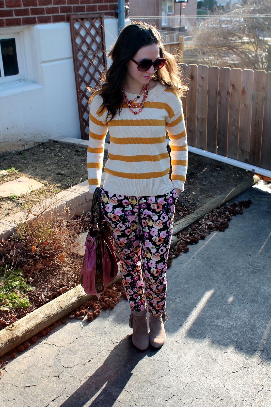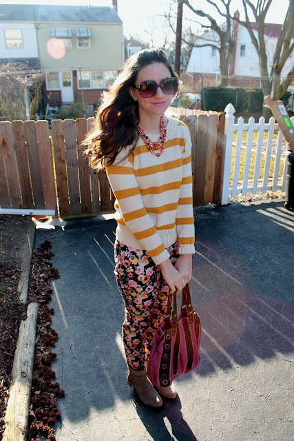 pants- H&M, sweater- J. Crew, booties- Sam Edelman, necklace- vintage, bag- Bling It On! (old), sunglasses- Target (old)