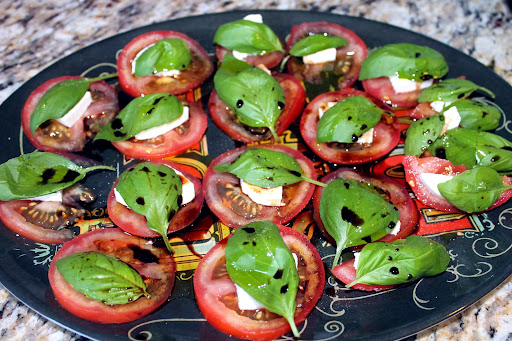 Slice the tomatoes and lay flat on a tray. Slice the mozzarella next (if your tomato slices are thin, you may want to cut the mozzarella into smaller pieces so that it doesn’t overpower the other flavors) and place over tomatoes, one piece per slice. Top each with a fresh basil leaf and drizzle the balsamic vinegar over top, following with the olive oil (I tend to be generous with my drizzling but I like to be able to taste the vinegar and oil). Sprinkle with a little salt and pepper and serve!
