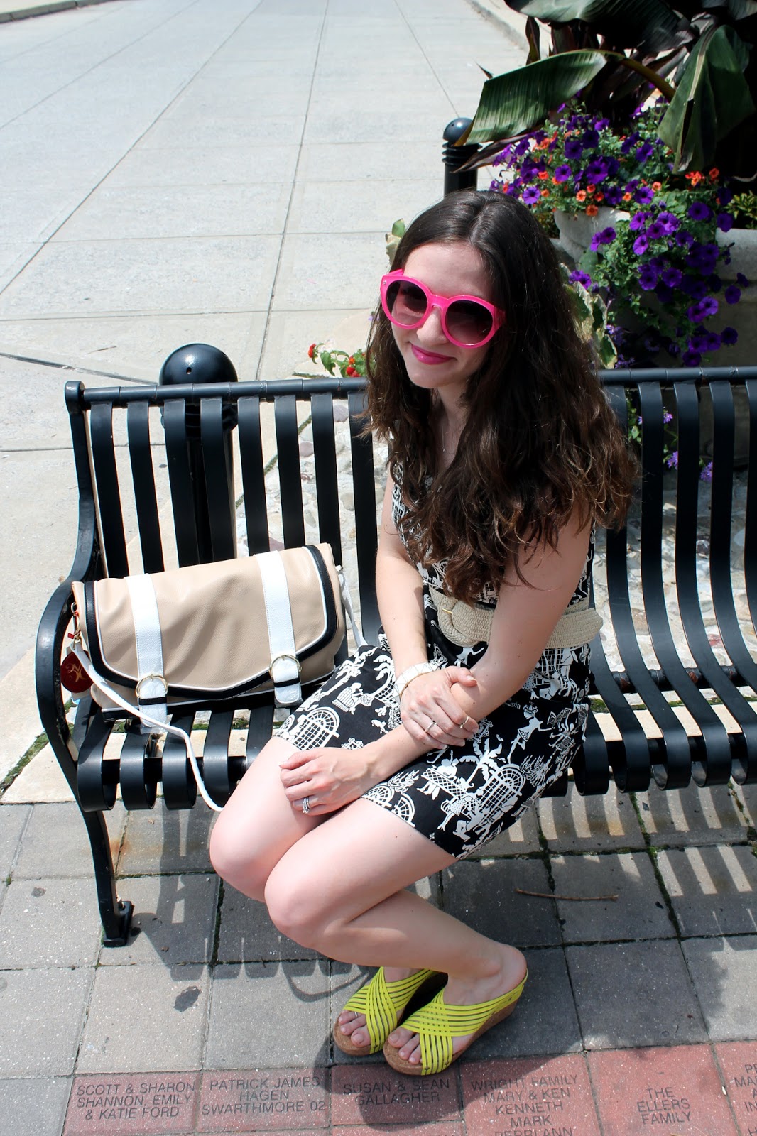 dress- Lilly Pulitzer, belt- Lilly Pulitzer, wedges- Lucky Brand, sunglasses- Nordstrom (similar), bag- c/o Vieta Fashion, bracelet- Forever 21 (similar 1, 2), lips- Bobbi Brown in Cosmic Raspberry