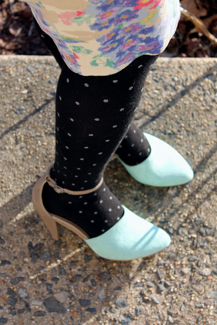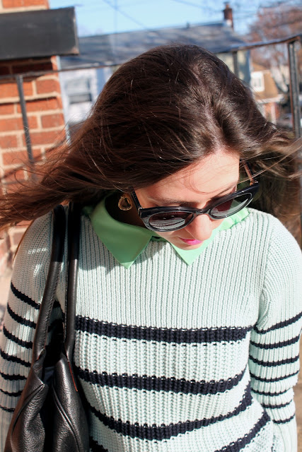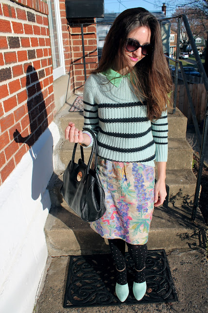 sweater- J. Crew, blouse- Madewell, skirt- Anthropologie, heels- Seychelles, tights- Hue, sunglasses- Kate Spade, earrings- Anthropologie, bracelet- J. Crew, bag- Kate Spade outlet