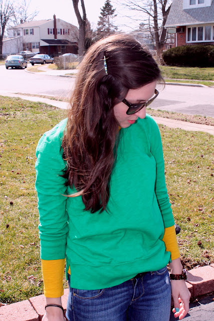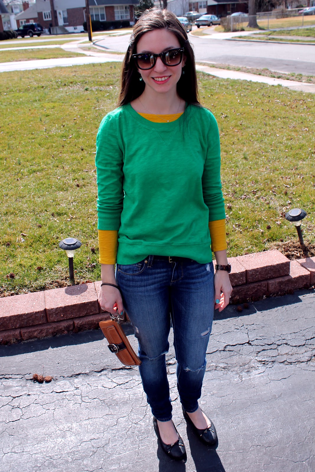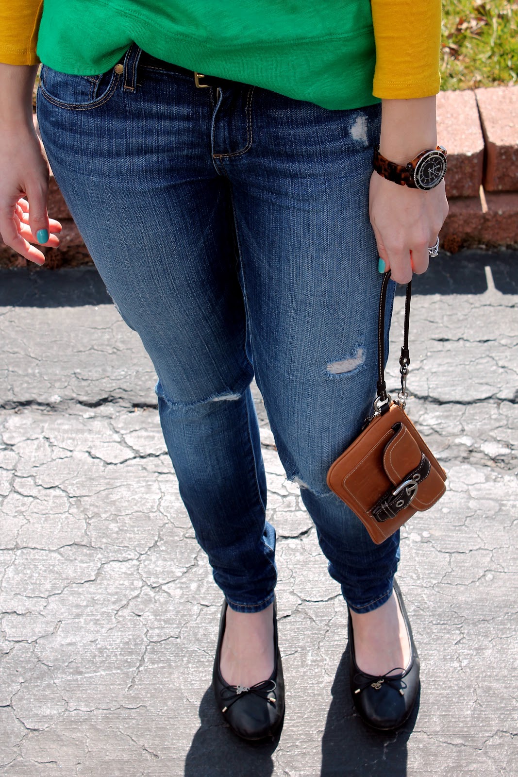 jeans- Paige Denim, sweater- J. Crew, top- J. Crew, belt- J. Crew, wristlet- Coach (old), flats- Sam Edelman, watch- Fossil, earrings and bobby pin- very old, sunglasses- Ray-Ban